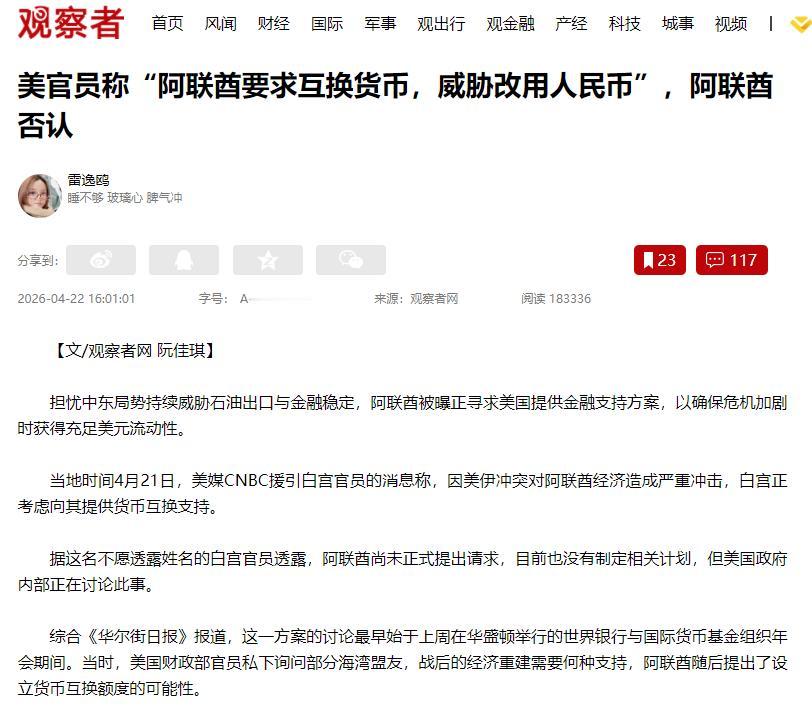 先说时间线,当地时间4月21日,美国CNBC电视台援引一位不敢透露姓名的白宫官员的话,说因为美伊冲突闹得太厉害,阿联酋经济受了大影响,所以白宫正琢磨着给阿联酋提供“货币互换”支持。