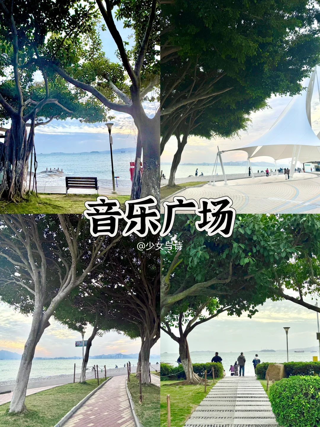 网红长椅拍清新氛围感照片,傍晚还有街头歌手弹唱,海风配歌声,待着就不想走