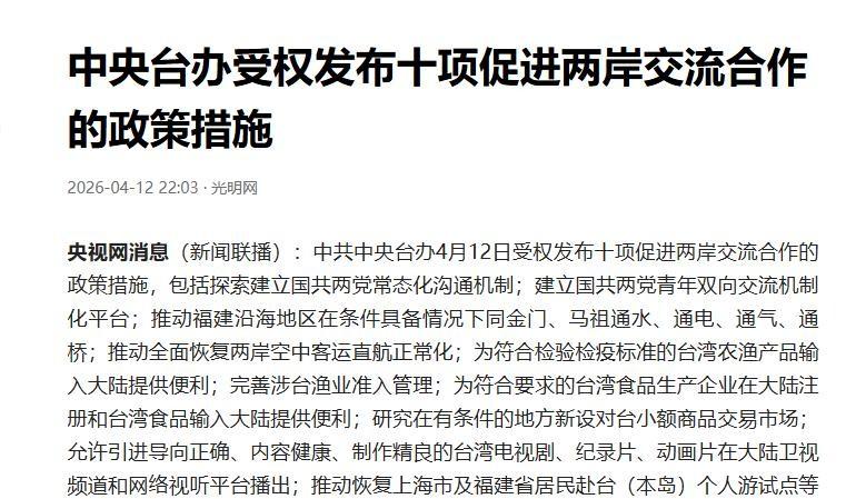 2026年4月12日,大陆出了好政策,促进两岸交流,大家期待,特别是那些产业,民生压力很大,长期对抗,谁能受得了。4月21日,卓荣泰说,时机成熟,可以谈谈,商务旅游农渔业,这话说得,有点意思,好像从不想到,可以想想了。