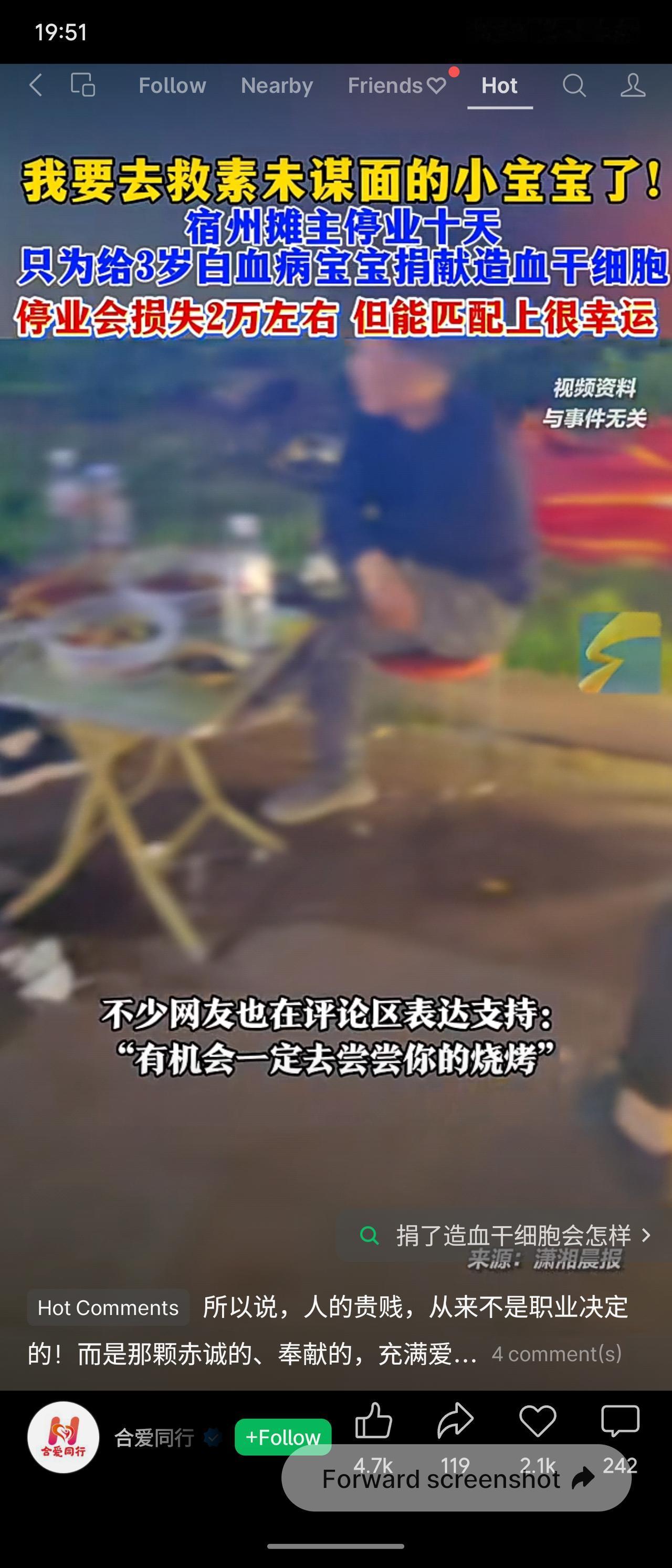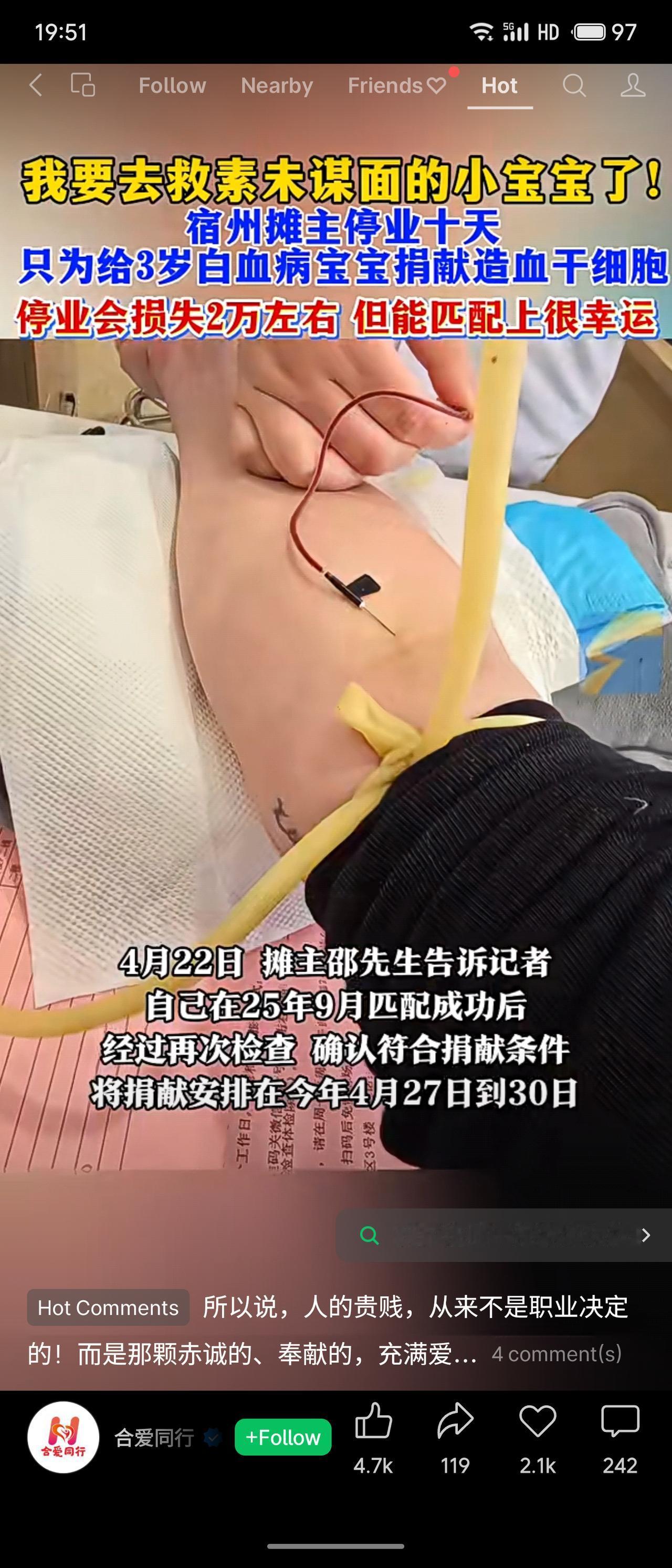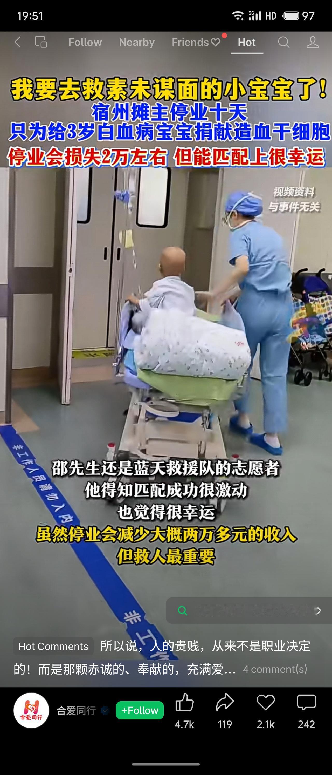 安徽宿州34岁烧烤摊主邵先生,也是蓝天救援队志愿者,为救助一名素未谋面的3岁白血病宝宝,停业十天前往合肥捐献造血干细胞。虽因此损失约2万元收入,但他表示能匹配上是幸运的,救人最重要。