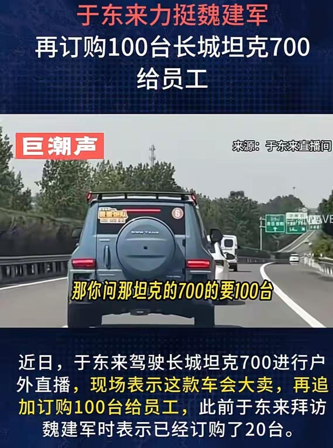 于东来开魏建军家的坦克700开上瘾了,之前订购20台,现在又下单100台,一口气5000万就这么花出去了,支持国产车真是眼睛不眨一下,大气。