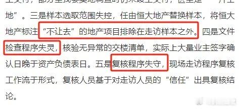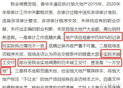 第一,地产项目观察中,约88%的记录与实际执行情况不一致。88%啊!造假简直到了明目张胆的地步!第二,普华永道现场走访认为符合交楼条件的楼盘,大部分实际未竣工交付。甚至更加离谱的是,部分楼盘等证监会去调查时,还是“一片空地”。可见当年普华永道的工作人员去走访时,应该是喝开心了。第三,样本选取范围失控。也就是恒大地产标注“不让去”的地产项目,他就不去走访。这可能就是所谓的“给钱就行”。第四,文件检查程序失灵。普华永道核验无异常的交楼清单,实际上大量业主签字确认日晚于资产负债表日。所谓的提前确认收入,互相勾结,一起把大家耍得团团转……