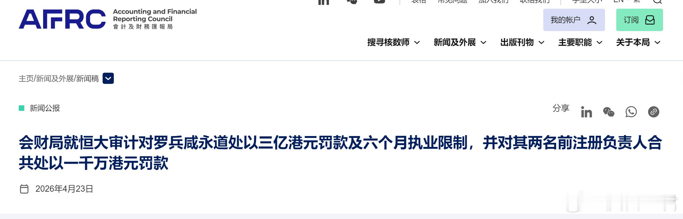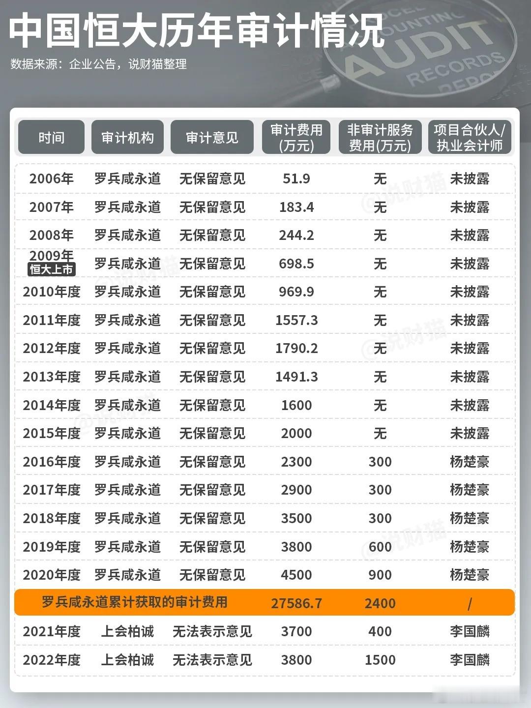 为2亿审计费,造2万亿窟窿。最终结果,总共被罚近16个亿。就在刚刚,香港证监会官网发布,就恒大虚假财报审计,与普华永道达成和解。普华永道香港同意预留10亿港元,以向中国恒大集团的合资格独立少数股东作出赔偿。同时,香港会财局就恒大审计,对普华永道处以3亿港元罚款及六个月执业限制,两名前注册负责人也被处以1000万港元罚款。