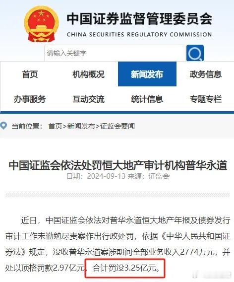 其实,之前,对于普华永道,内地其实已经处罚过。2024年9月,财政部与证监会同时在官网发布处罚决定书,合计对普华永道罚没4.41亿元。其中,证监会对涉及恒大地产2019年、2020年审计项目的违法行为没收业务收入2774万元并处顶格罚款2.97亿元,合计罚没3.25亿元;财政部对涉及2018年审计项目罚没1.16亿元。