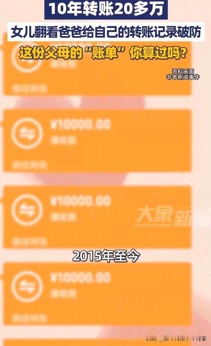 4月22日,江苏一位女士整理近10年的收支账单时意外发现,从读大学到参加工作,父亲陆陆续续给她的转账加起来竟有21万余元。平时一笔笔几百、几千的转账只当是日常贴补,没觉得有多特别,可看到汇总数字的那一刻,她瞬间红了眼眶。