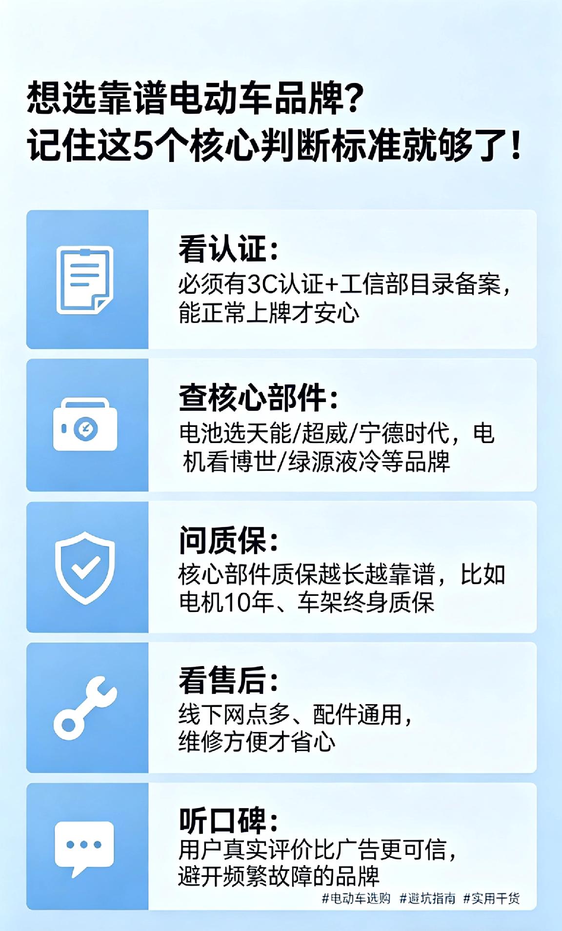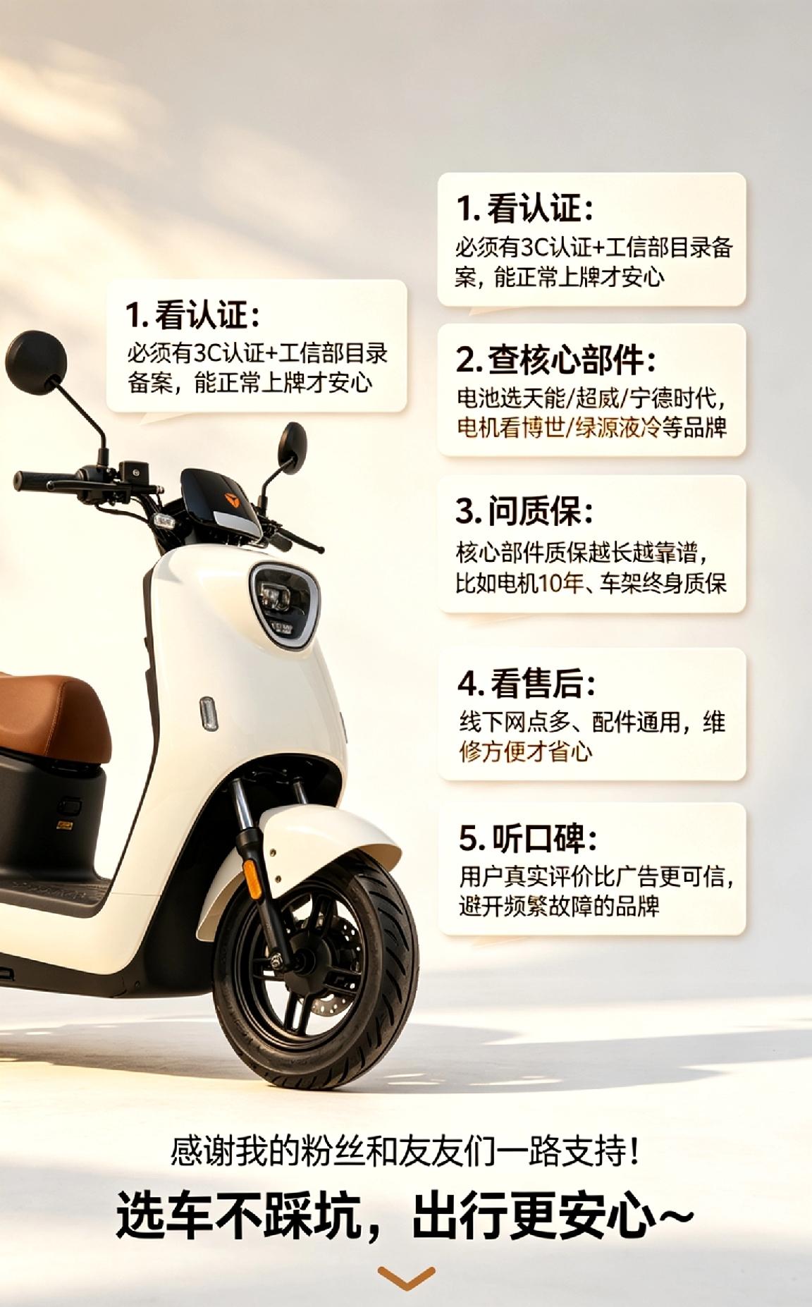 3️⃣ 问质保:核心部件质保越长越靠谱,比如电机10年、车架终身质保