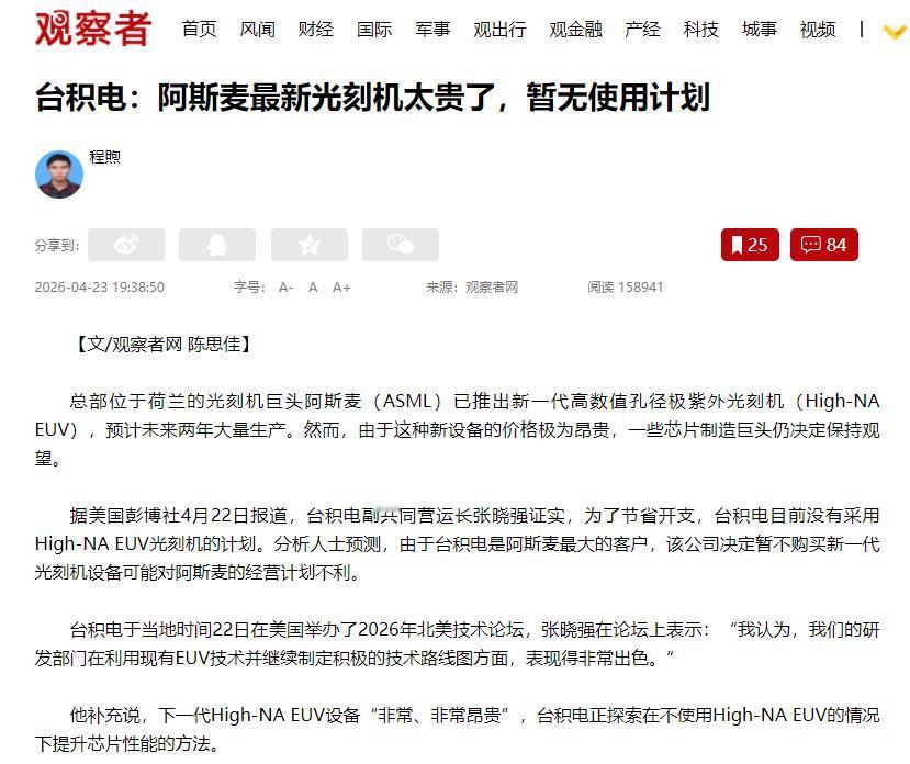 最近半导体圈有个大新闻,台积电明说了,暂时不买阿斯麦最新的光刻机。 这事一点不