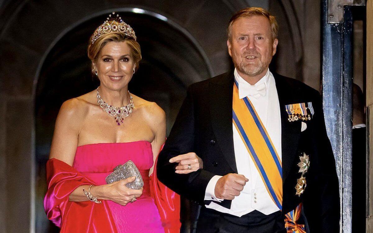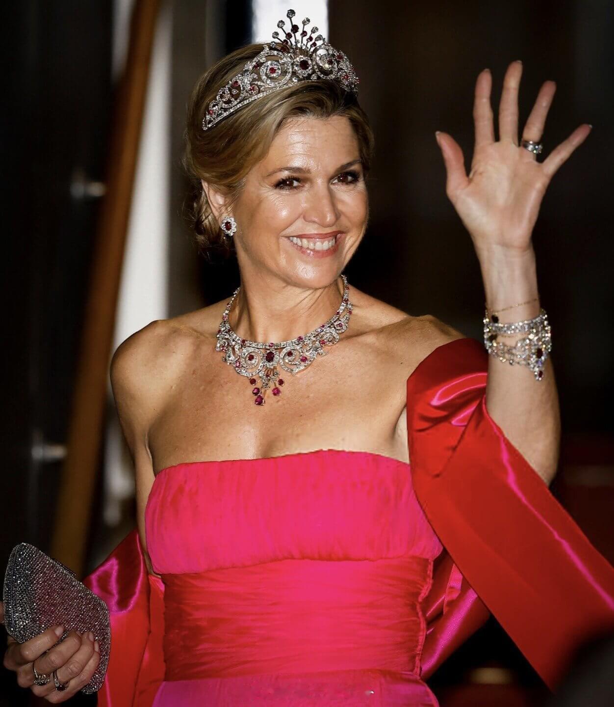 4.23 荷兰国王威廉-亚历山大和玛克西玛王后出席外交接待晚宴,玛克西玛这条晃得眼睛疼的艳桃红礼服也有个快20年了