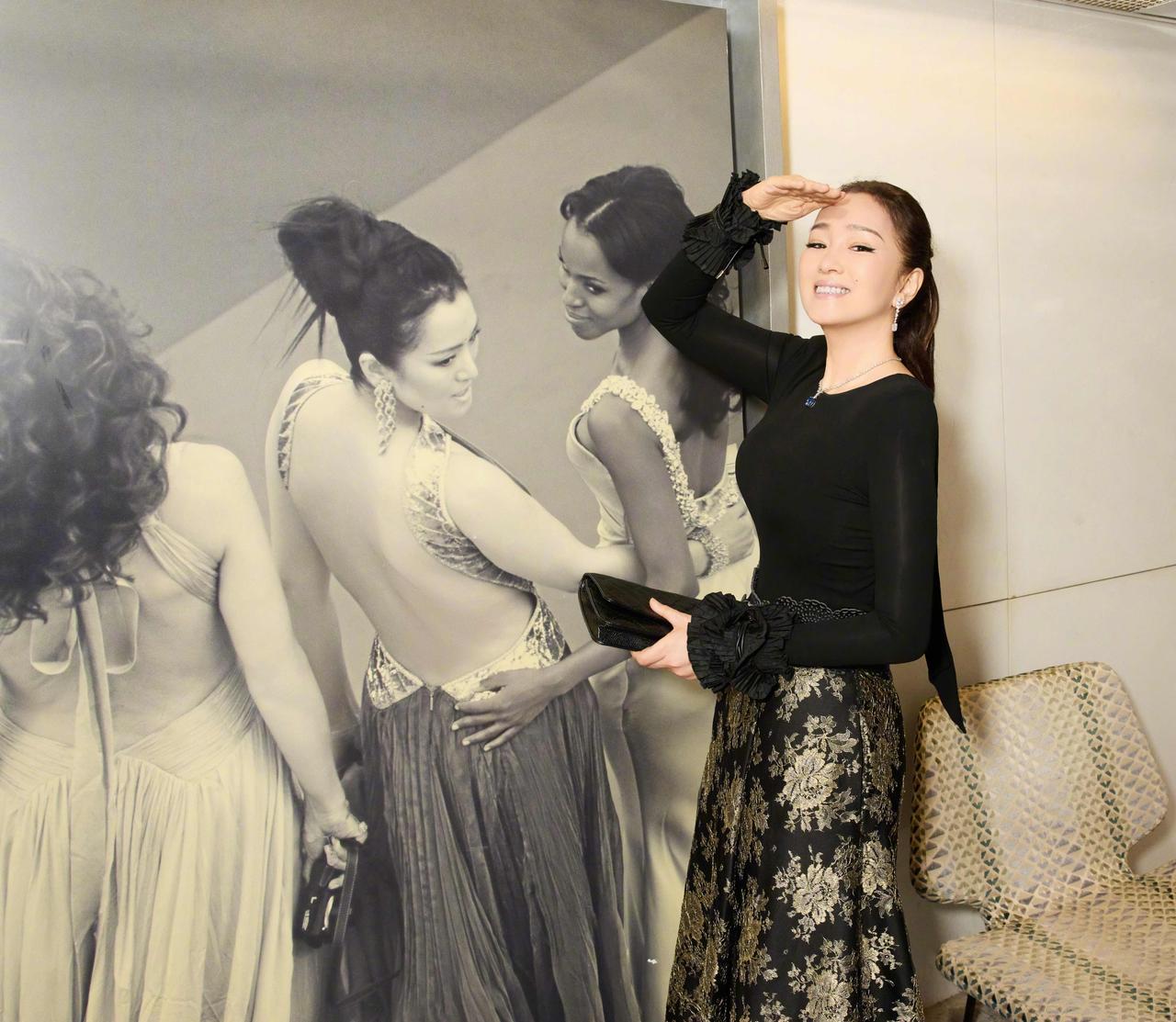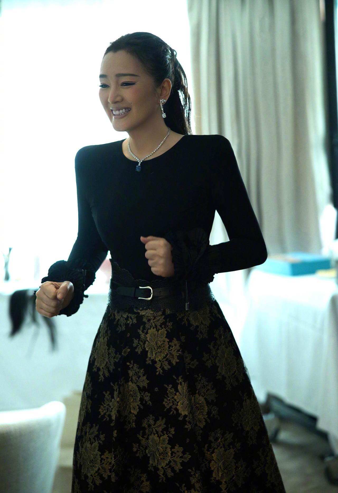 她身着黑色修身上衣,袖口的木耳边褶皱暗藏精致,高腰蕾丝腰带搭配鎏金提花半裙,将身材比例勾勒得恰到好处,步履从容间,那份独属“巩皇”的优雅与气场扑面而来,东方风骨与法式浪漫在她身上完美交融。