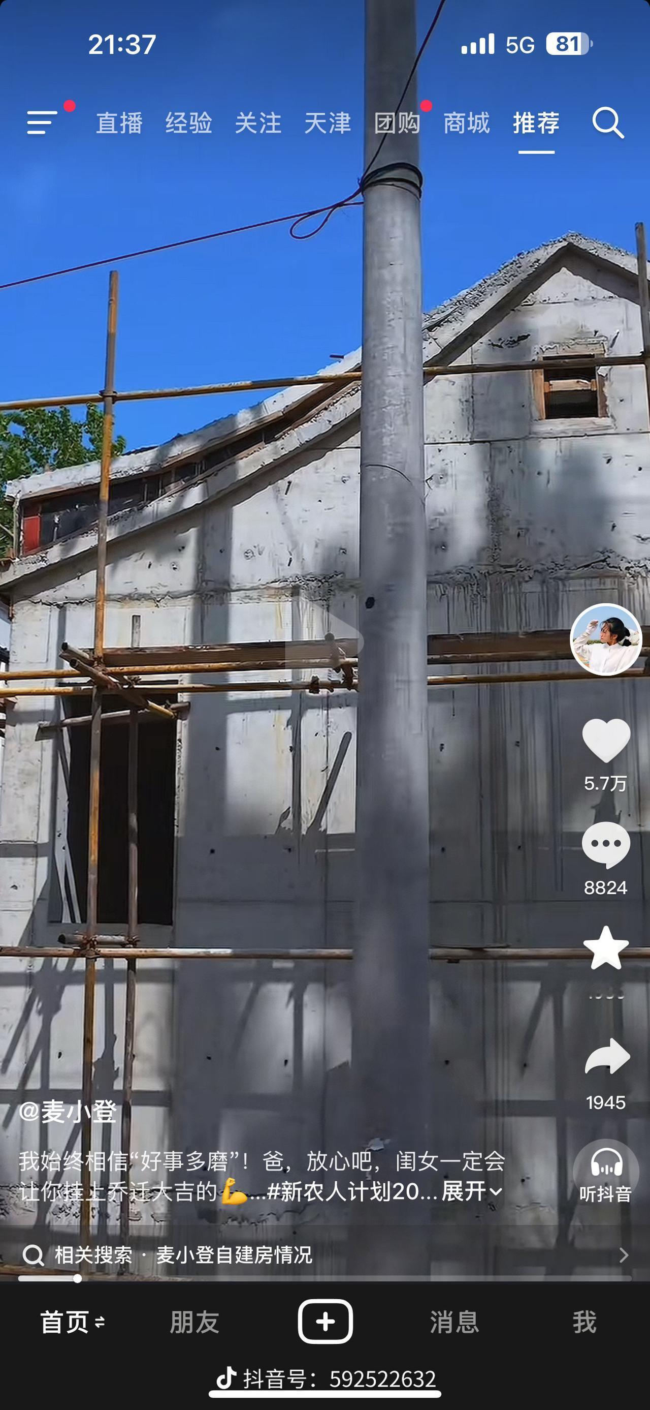 麦小登这回是遇到硬茬了,在老家盖个房子,两年了还没盖起来。先是在父亲五老哥兄弟几个公共的宅基地上盖,都打好地基了,村里人各种投诉,放弃了。然后扒了老房子原址盖,本来想盖两层,有人不让,那就盖一层吧,还是磕磕绊绊,现在都封顶了,又进行不下去了。五老哥看着停工的房子眼泪都快流下来了,“我就是想有个家,可是现在连小狗的家都没了”。麦小登无奈的对大爷说,“要是我是个儿子就好了,如果是个儿子别人就不会这么欺负人了吧!”,虽然原因不明,但是大概是邻里纠纷使坏吧。只是想不明白,手续合法,在自己的宅基地里盖个房子咋就那么难? 这个事情也惹得大量粉丝抱不平,但是麦小凳还是很有顾忌,害怕网上曝光了给地方带来不好的影响,只是一步步的退让换来无休无止的阻拦,还是太善良了!