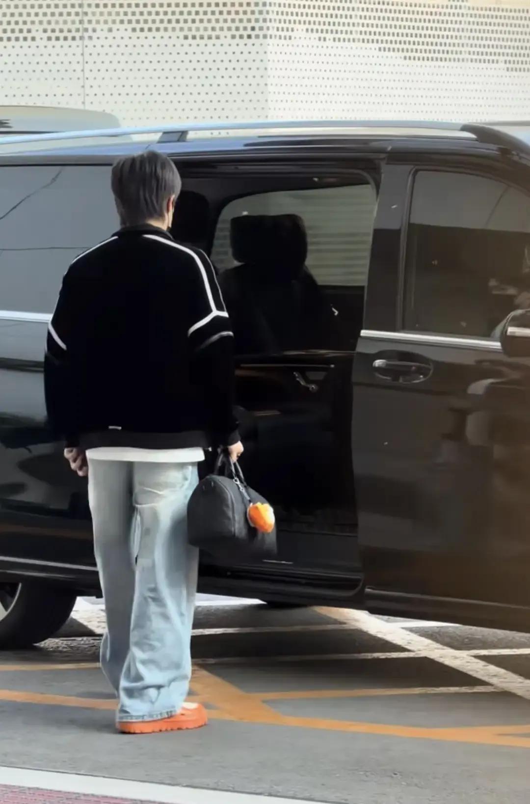 CC穿宽松卫衣,箱子轱辘咔哒咔哒响,草莓熊一路低头刷手机,偶尔抬头冲镜头笑一下。