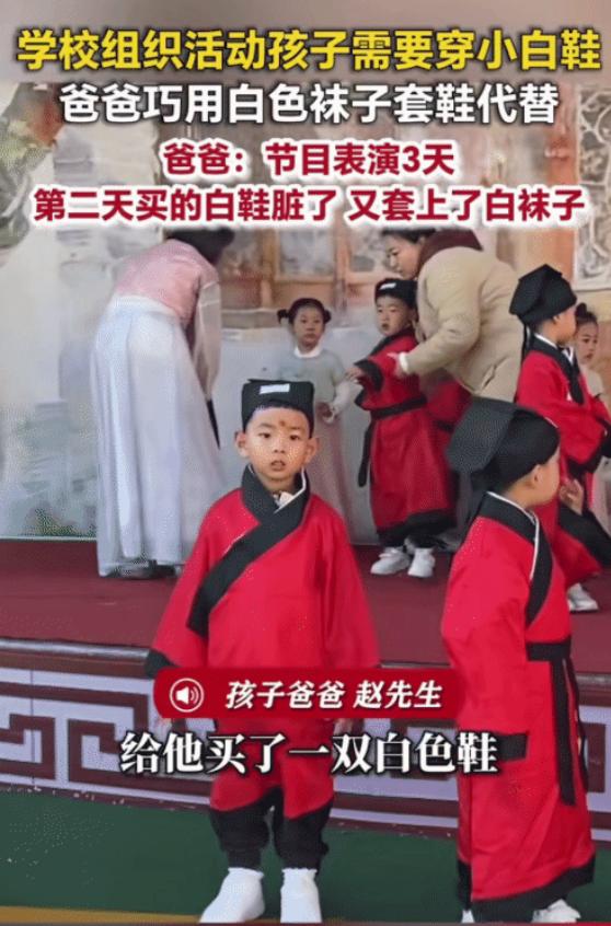 “太机智了!”内蒙古通辽,学校组织的活动需要穿小白鞋,小男孩没有,没想到,他爸爸灵机一动,找了一双白袜子套在他鞋子上,立马变小白鞋,更没想到,他爸爸给他买了小白鞋,不到一天就脏了,他爸爸又给他小白鞋套上了白袜子。
