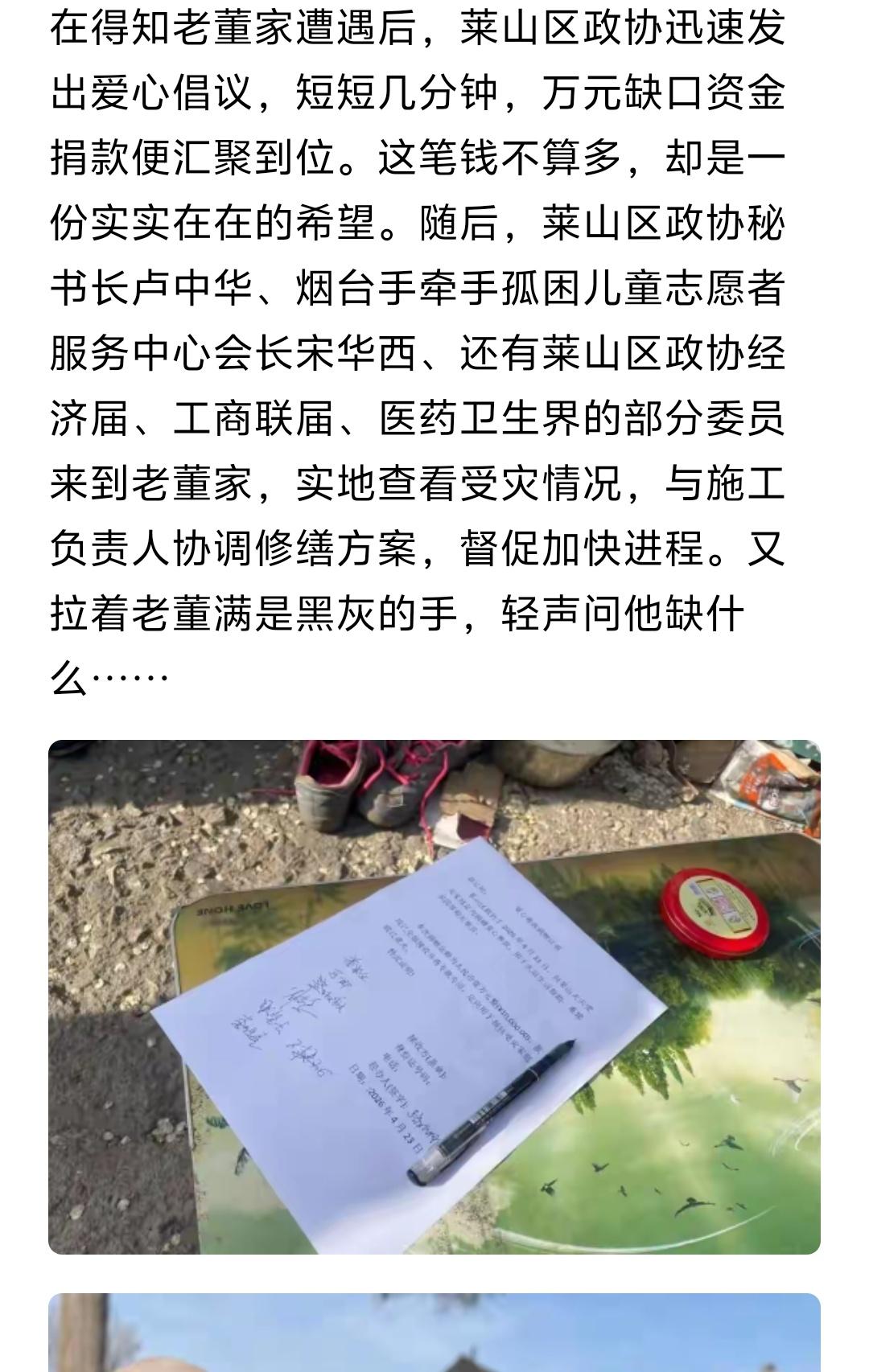 过往我们总说“一方有难,八方支援”,面对贫困户家里突发火灾烧毁全部家当,莱山政协这一次做的充分体现了“一家有难,八方支援”,莱山政协这一次工作做的真的值得肯定,在莱山政协倡议下,很快就募集了足够的资金,让这个遭受危难的家庭感受到了来自莱山的温暖!