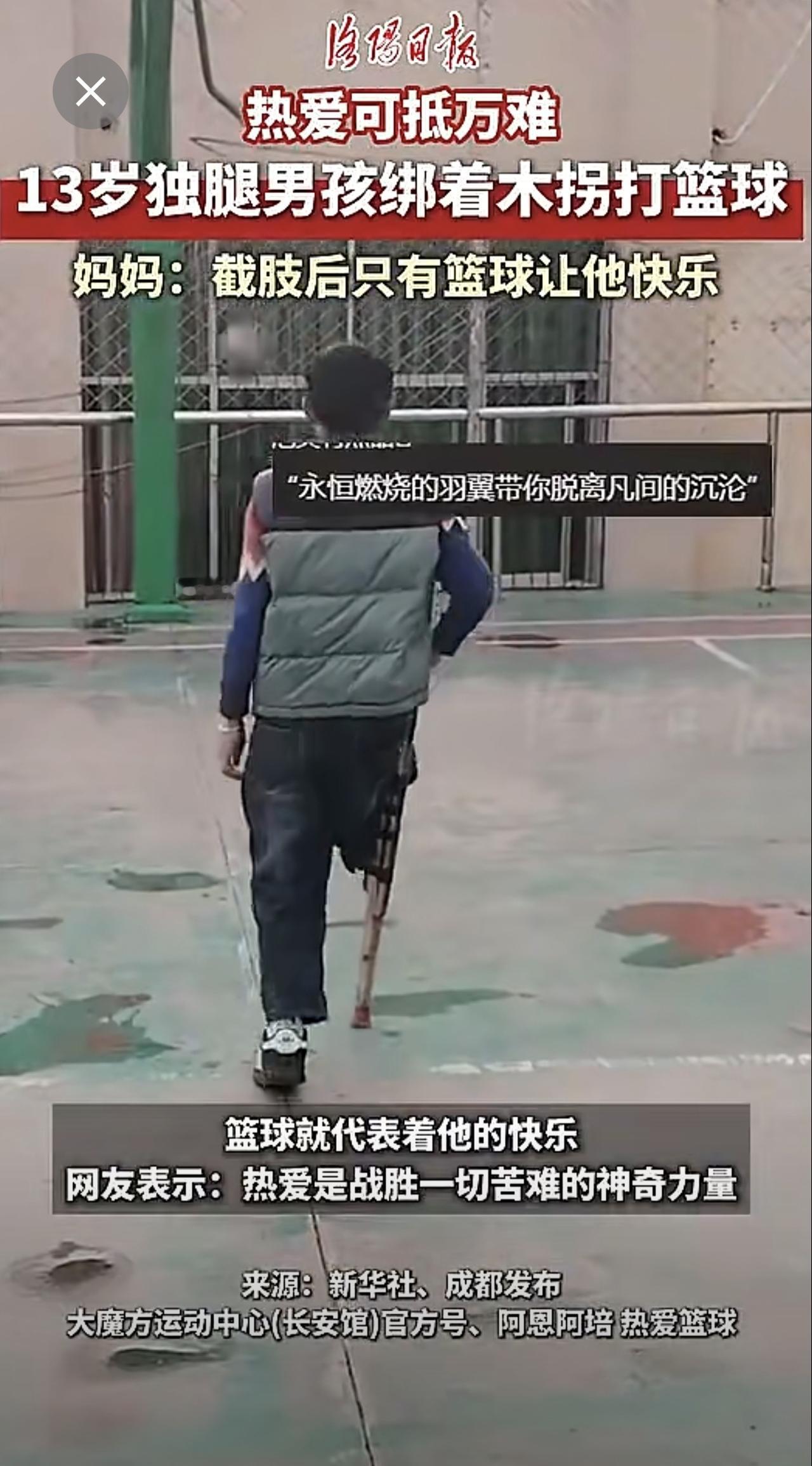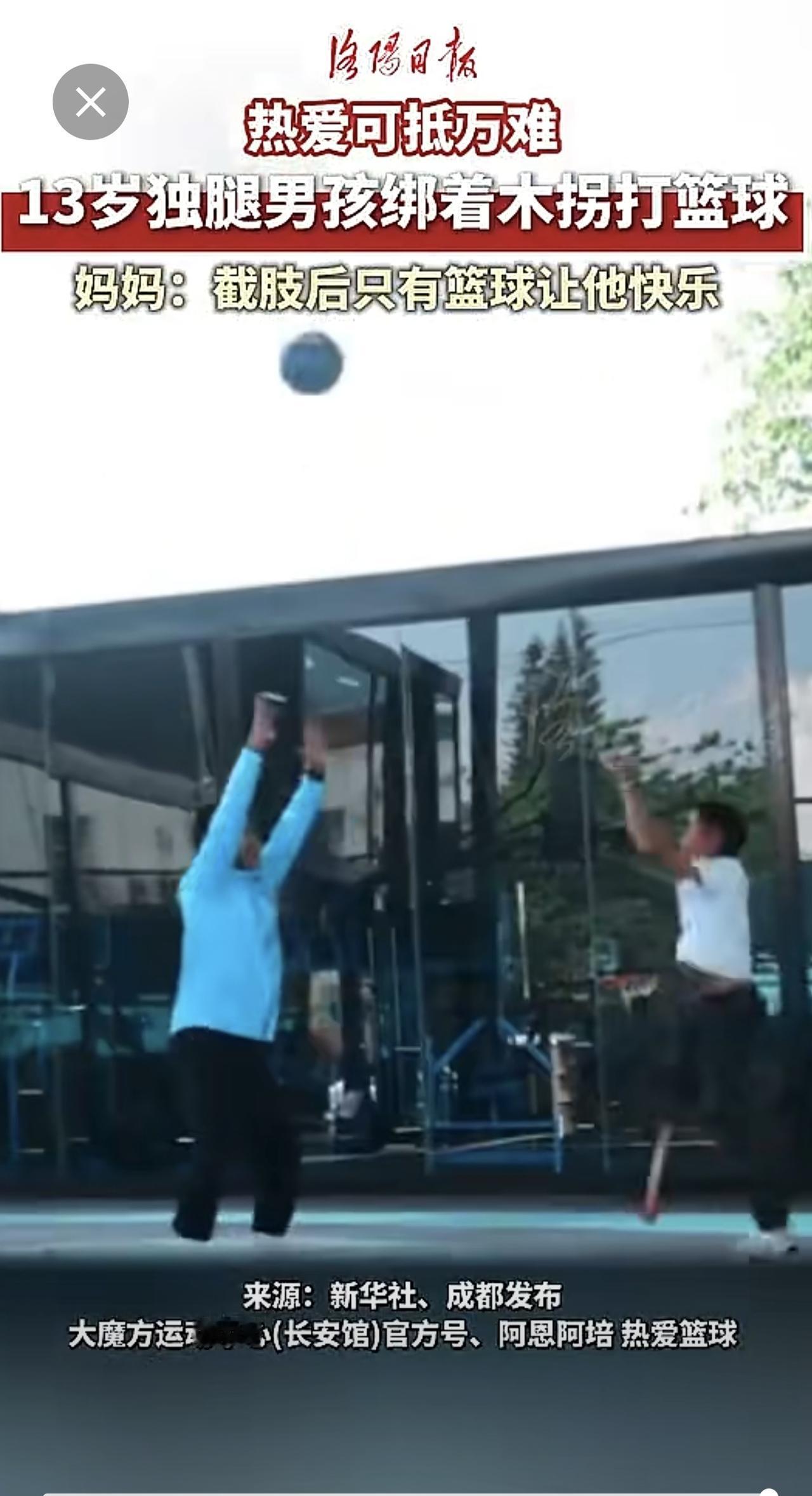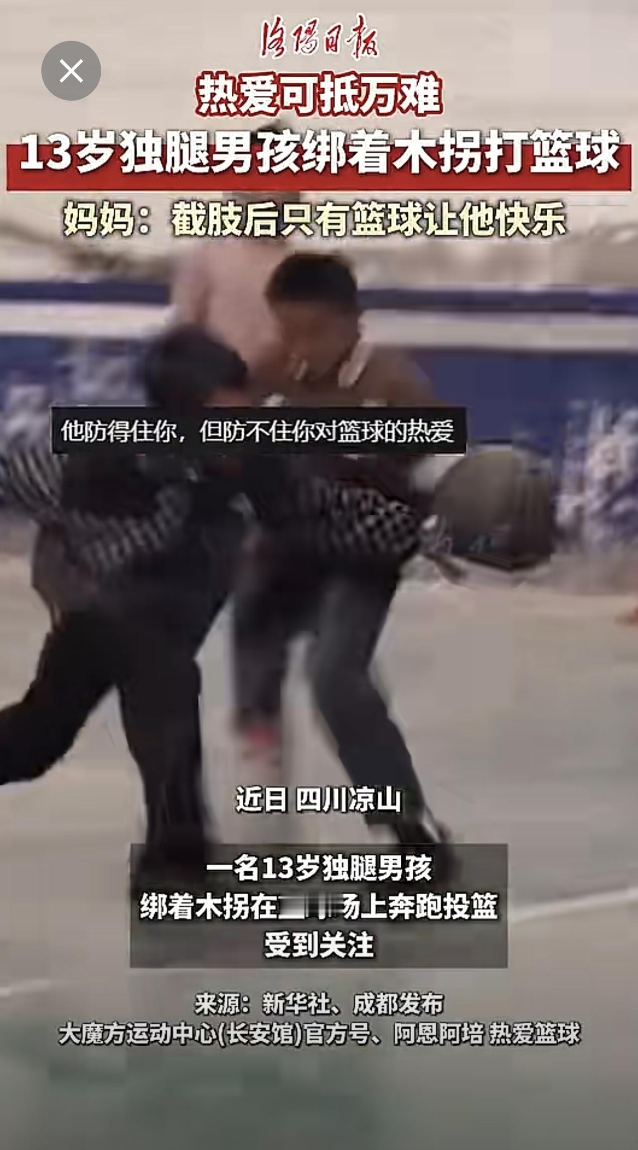热爱可抵万难!13岁凉山男孩绑着木拐打篮球。(来源:洛阳日报)