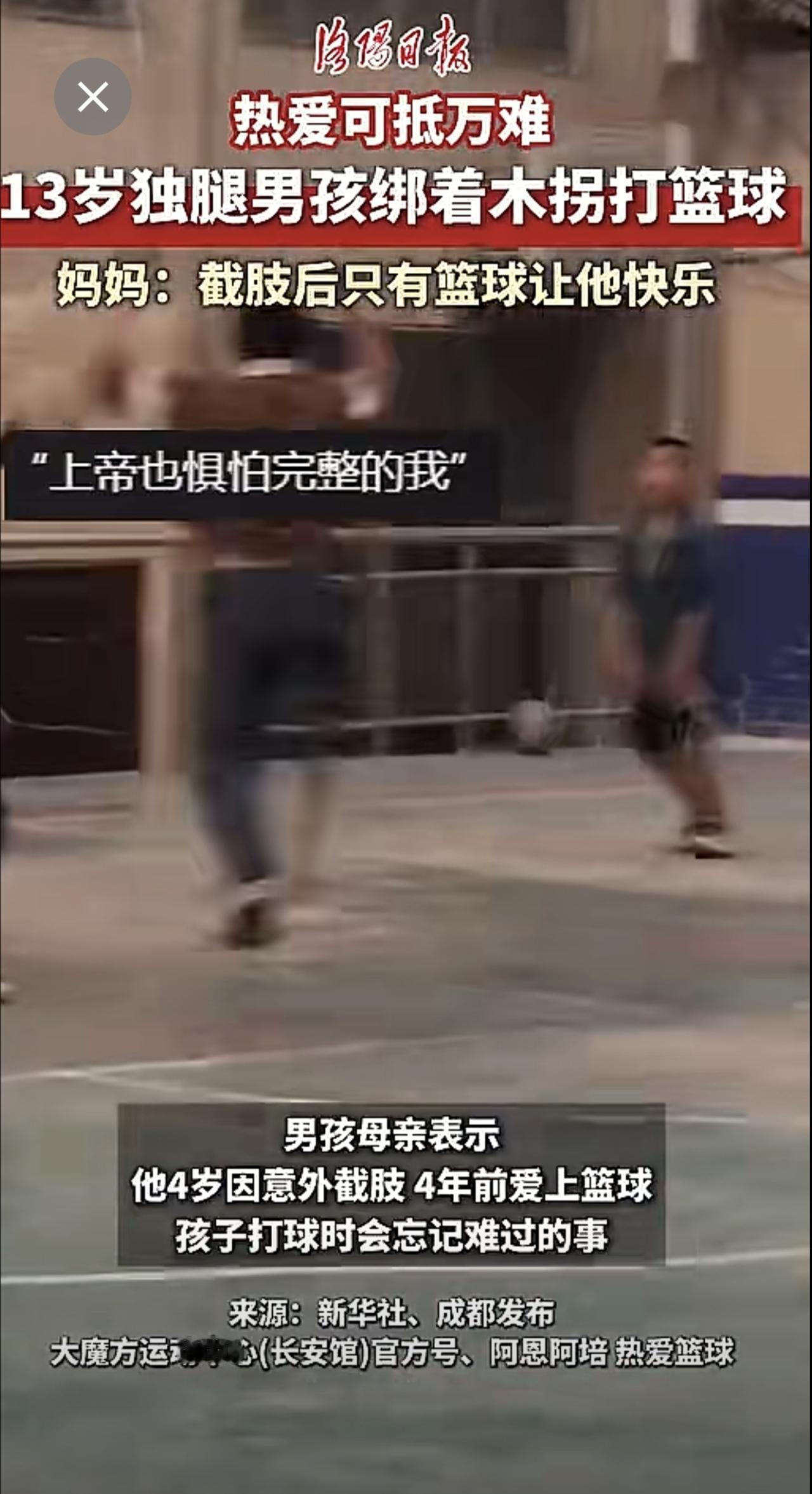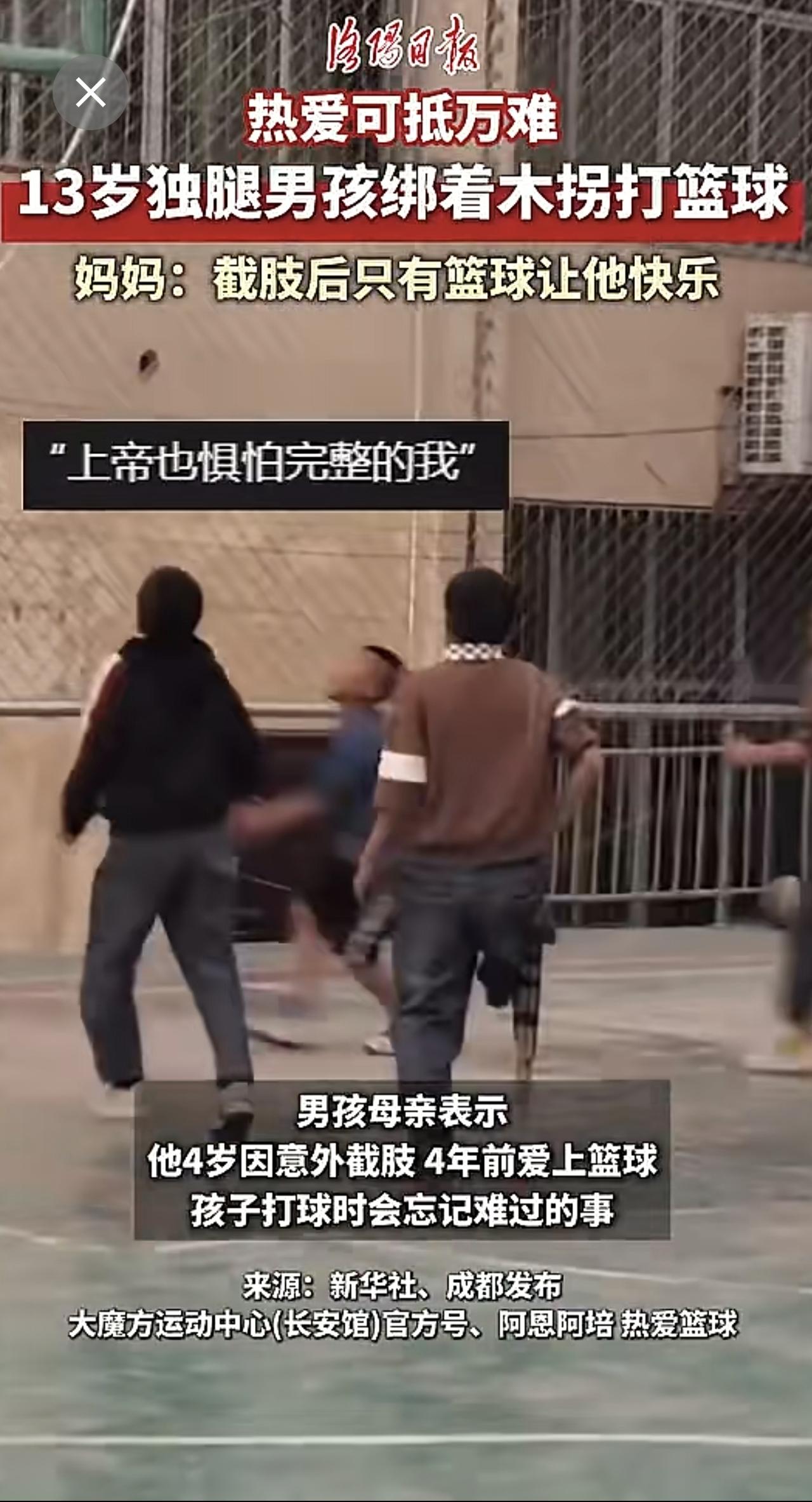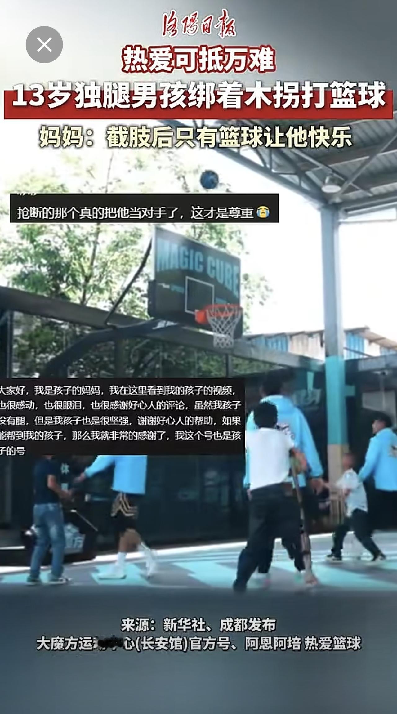 热爱可抵万难!13岁凉山男孩绑着木拐打篮球。(来源:洛阳日报)