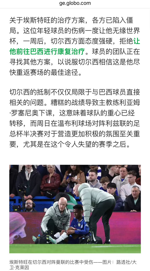 看不出和在哪里治疗有什么关系… 假设受伤等级为3级(几乎完全撕裂)也不可能在30天内恢复.切尔西不同意Estevao返回巴西治疗,巴西官方也在犹豫是否要批准这个治疗方案…应该有个人去劝他放弃世界杯…这样对所有人都好.