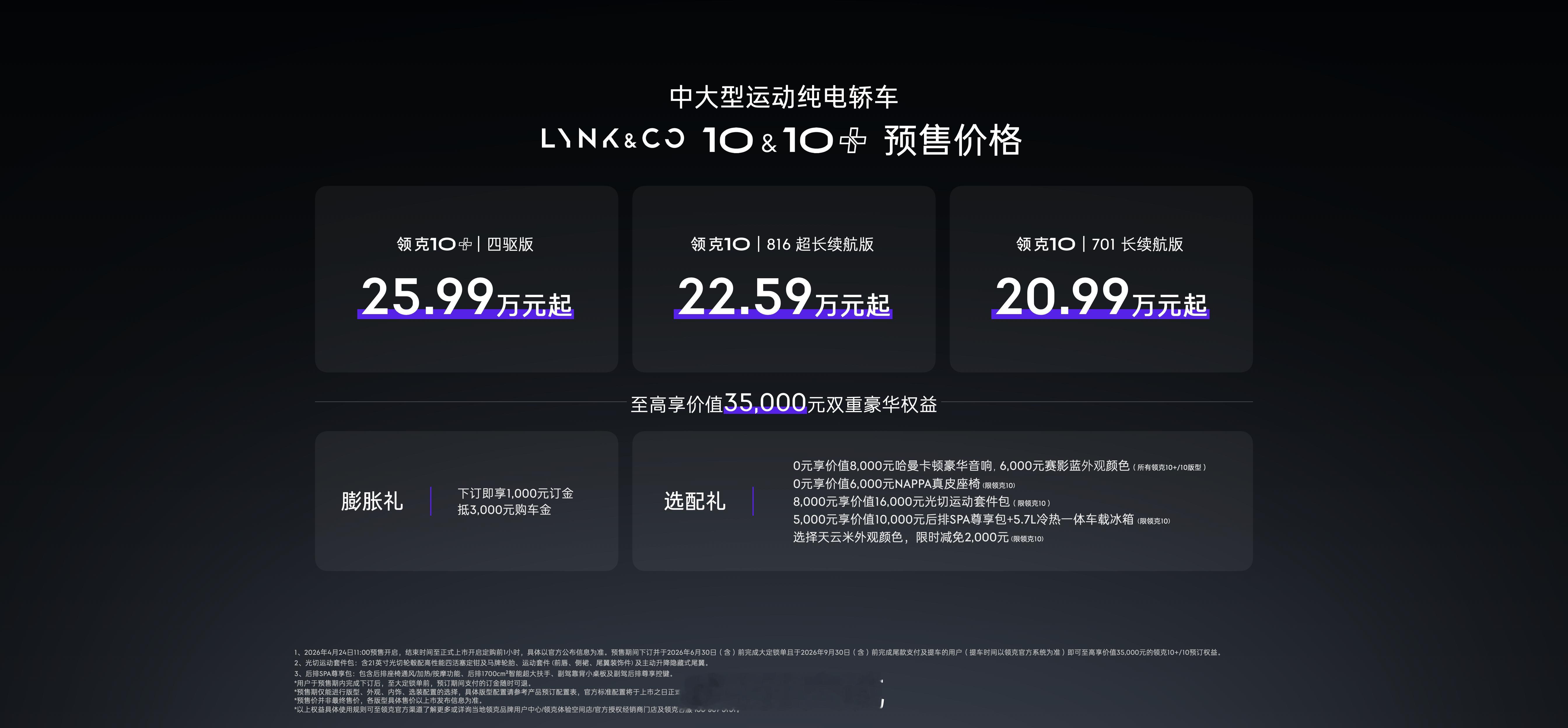 北京车展首日,领克 10、领克 10+ 中大型运动纯电轿车正式开启预售。领克10 701长续航版:20.99万起领克10 816超长续航版:22.59万起领克10+四驱性能版:25.99万起