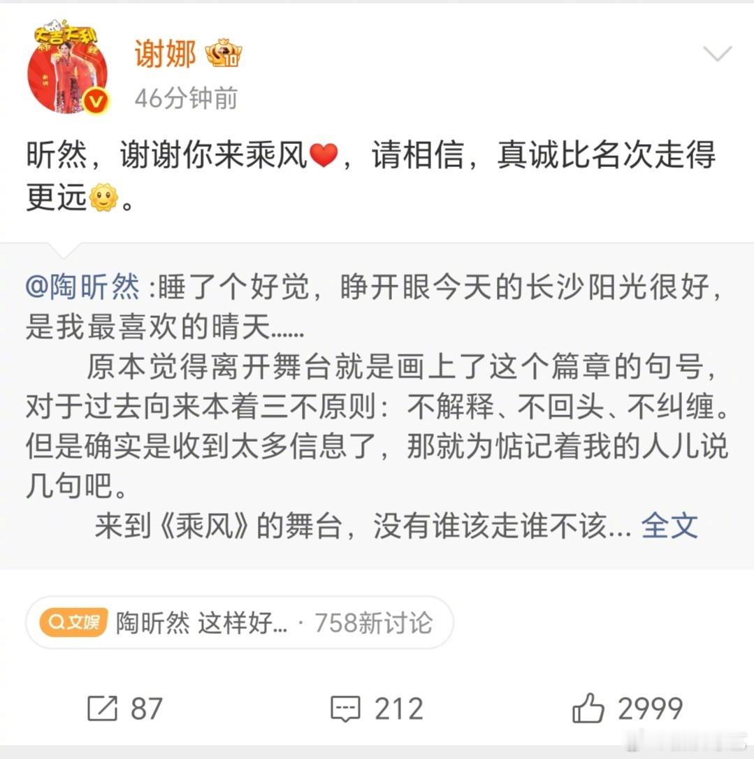 谢娜感谢陶昕然能来乘风陶昕然发长文回应淘汰 娜姐发文感谢姐姐参加乘风舞台,“请相信,真诚比名次走得更远!”娜姐说得也很真诚!昕然姐姐舞台表现力超棒,期待未来解锁更多精彩!乘风2026