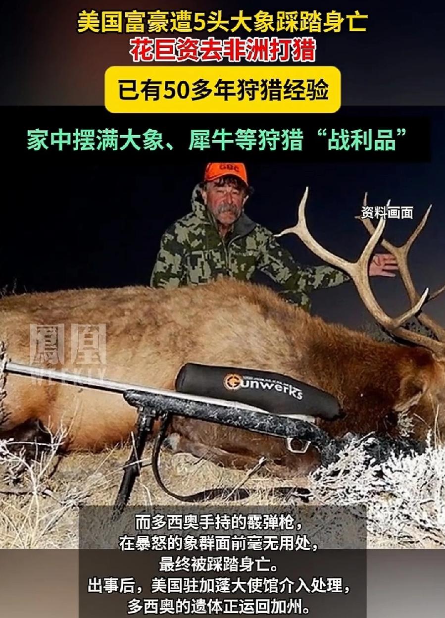 美国75岁富豪被5头大象踩死,肯定都成肉泥了,从小就喜欢狩猎,长期狩猎就有50多年,猎杀过狮子、豹、犀牛、水牛、大象,几乎所有野鹿品种,家中还有野生动物战利品小型博物馆,可是常在河边走哪能不湿鞋,倒在了自己的热爱,是不幸也是一种幸运!