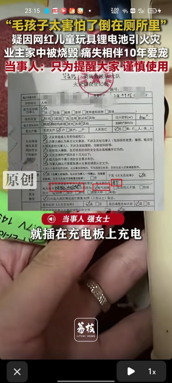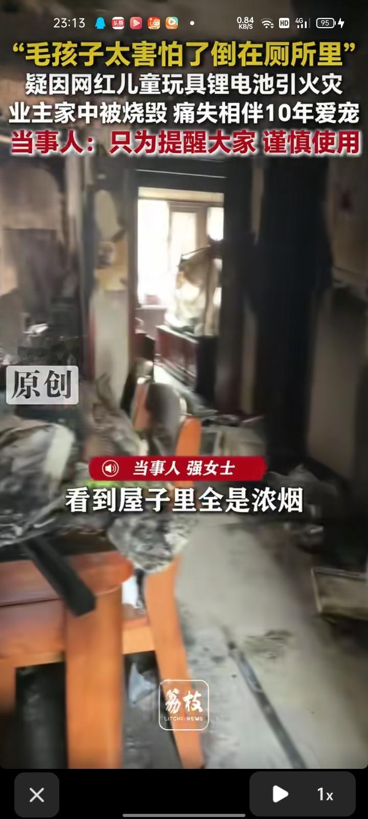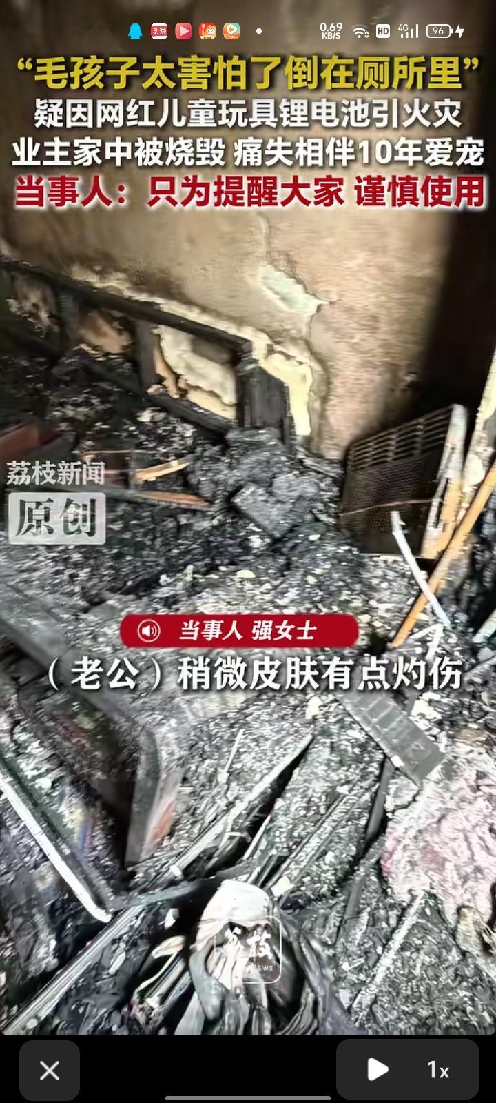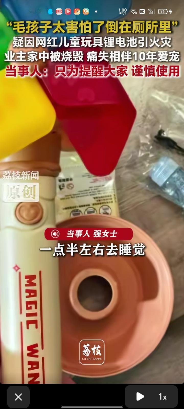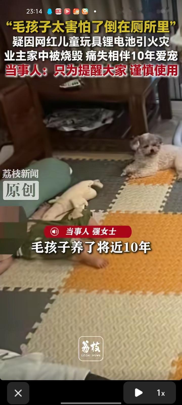 宠物狗养了将近十年,它倒在了厕所里,而老公稍微皮肤有点灼伤,事后复盘到一点半左右去睡觉。事发时风车玩具里面裸露的锂电池插在充电板上充电,现在东西被烧透了。目前,女子已向平台及工商部门投诉,希望能提醒更多人,切勿购买劣质儿童玩具