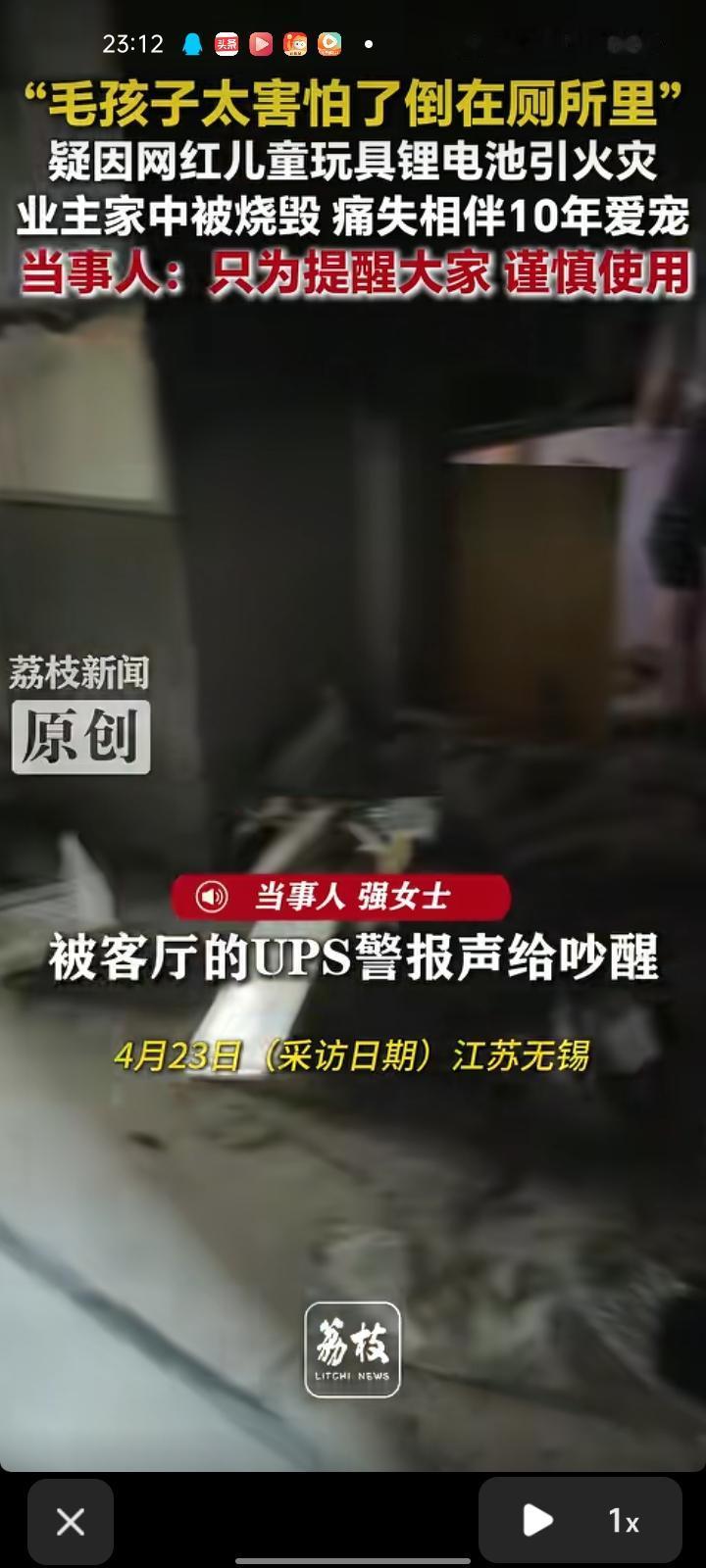 4月18日,江苏无锡。女子发视频称,大约凌晨四点多,被客厅的UPS警报声吵醒,看见屋子里全是浓烟,大喊家中宠物狗的名字,但没反应,然后带着孩子光着屁股就跑出去了。老公三次跑回火场,把手机拿出来才报警。