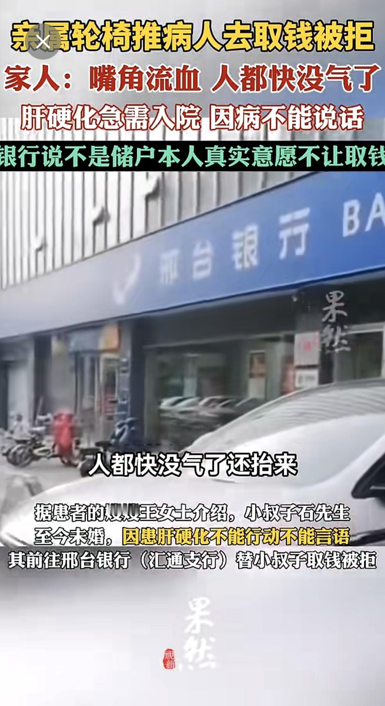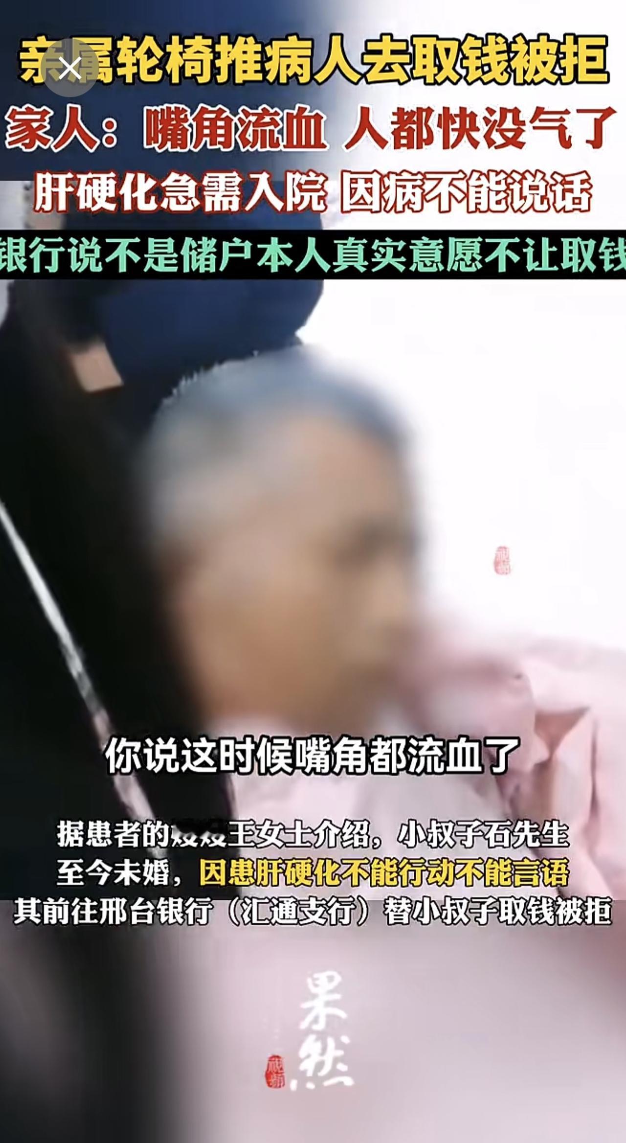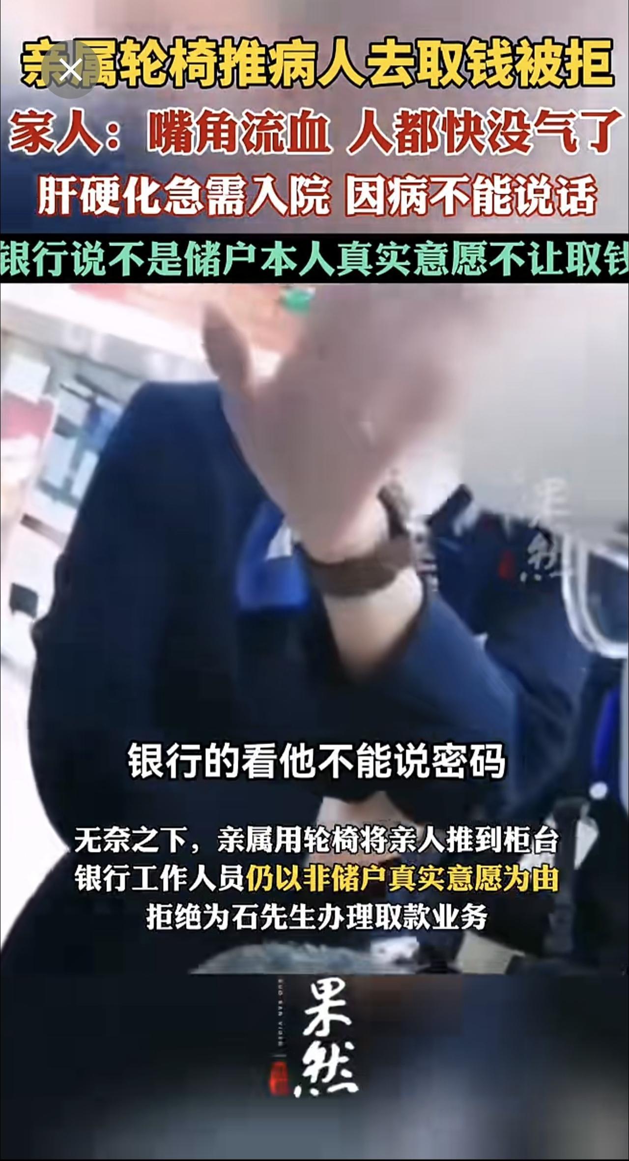 亲属轮椅推病人去取钱被拒。