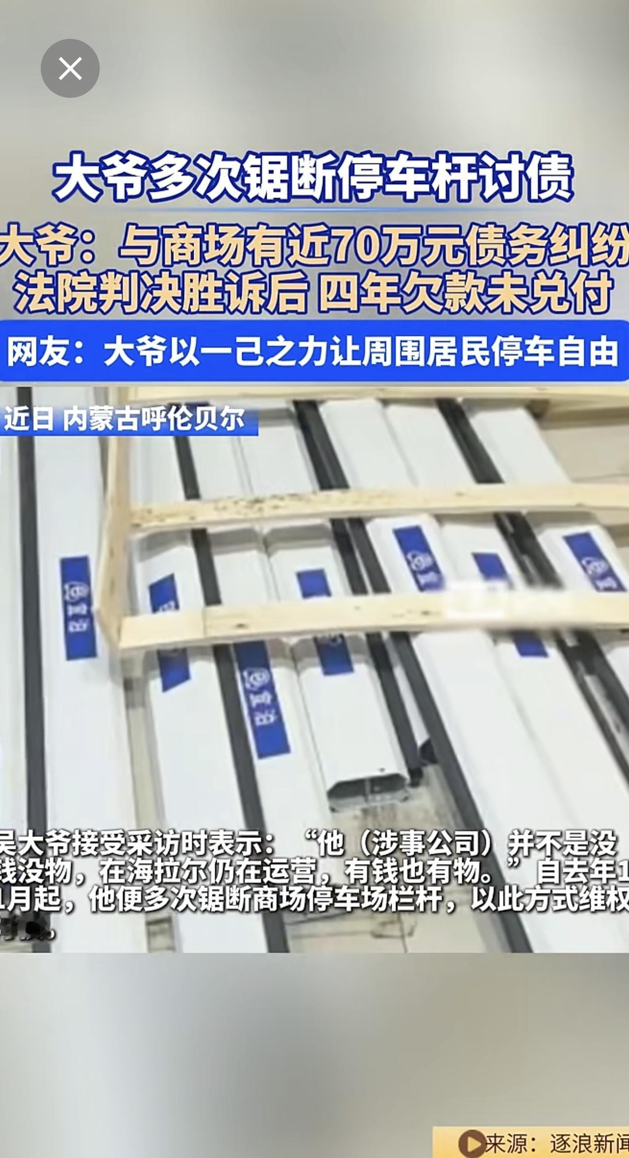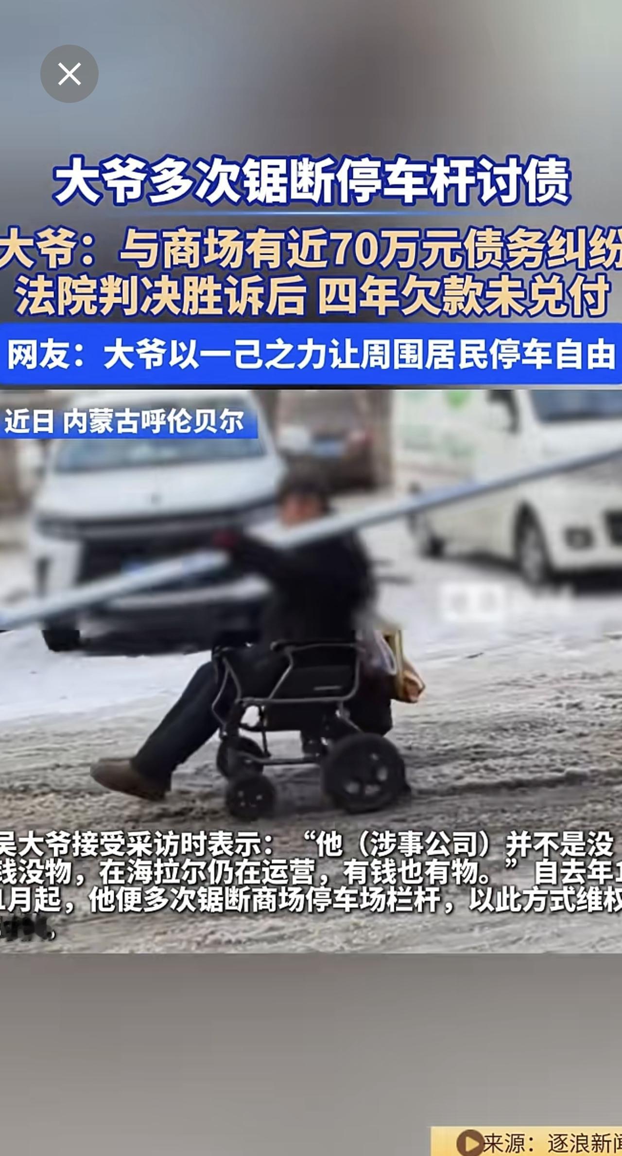 大爷多次锯断停车杆讨债 ,“与商场有近70万元债务纠纷 ,法院判决胜诉后,四年欠款未兑付”网友:大爷以一己之力让周围居民停车自由(编辑:李津桥)