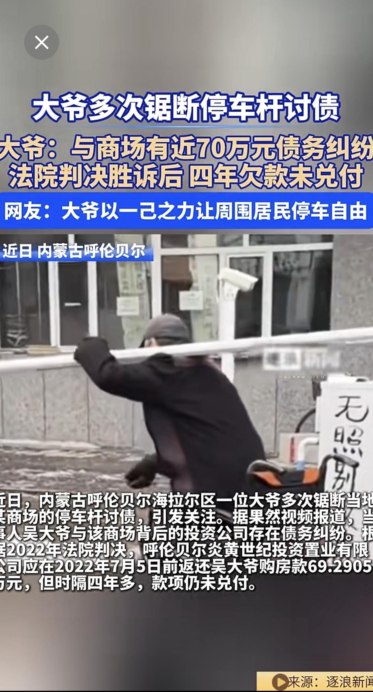 内蒙古一大爷胜诉四年,商场欠70万元未兑付,多次锯断商场停车场栏杆讨债!当地街道