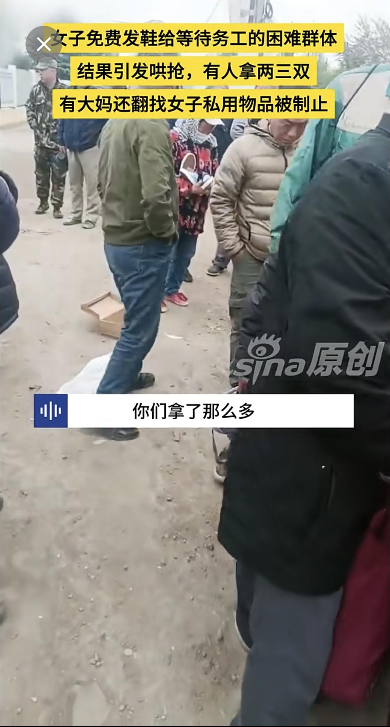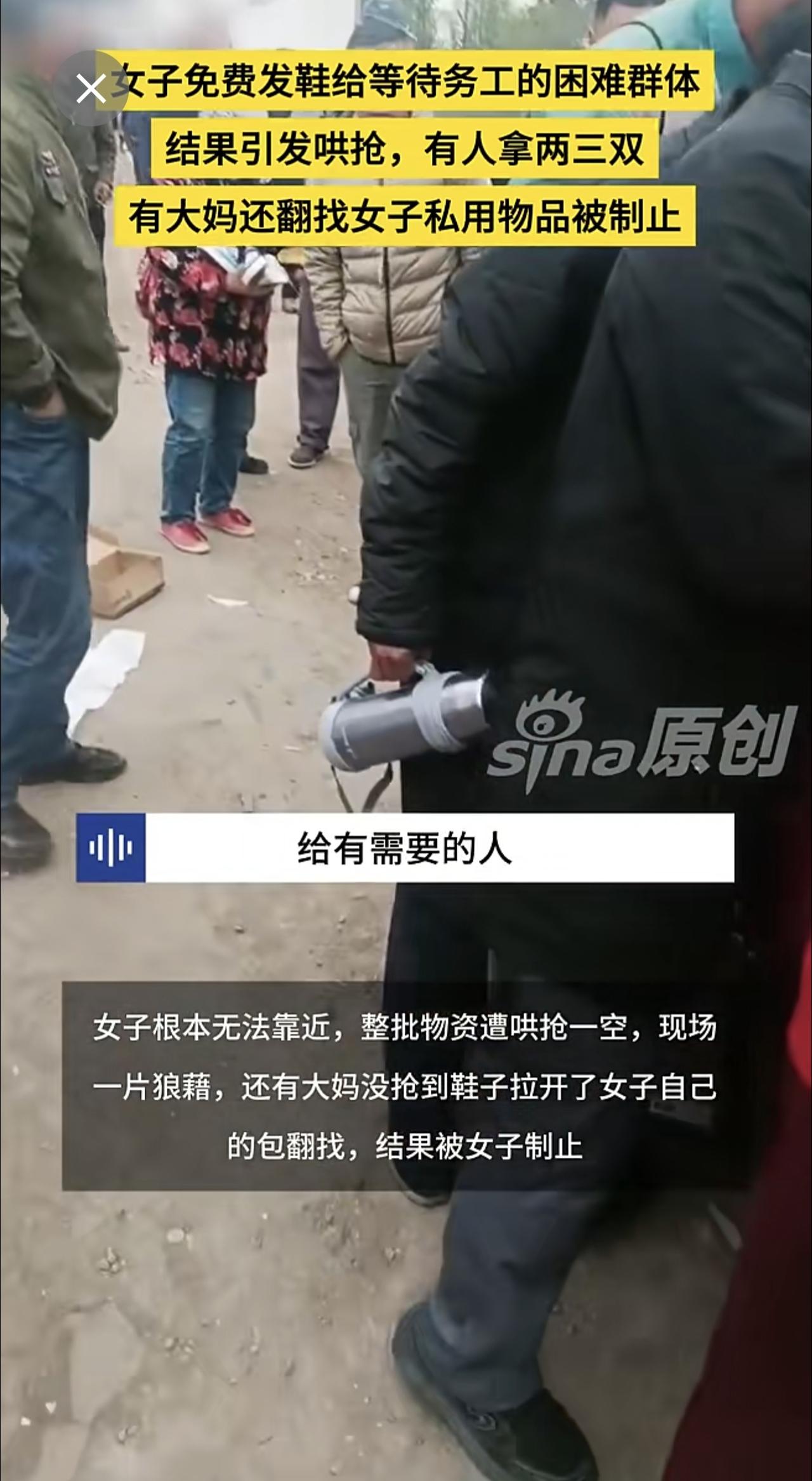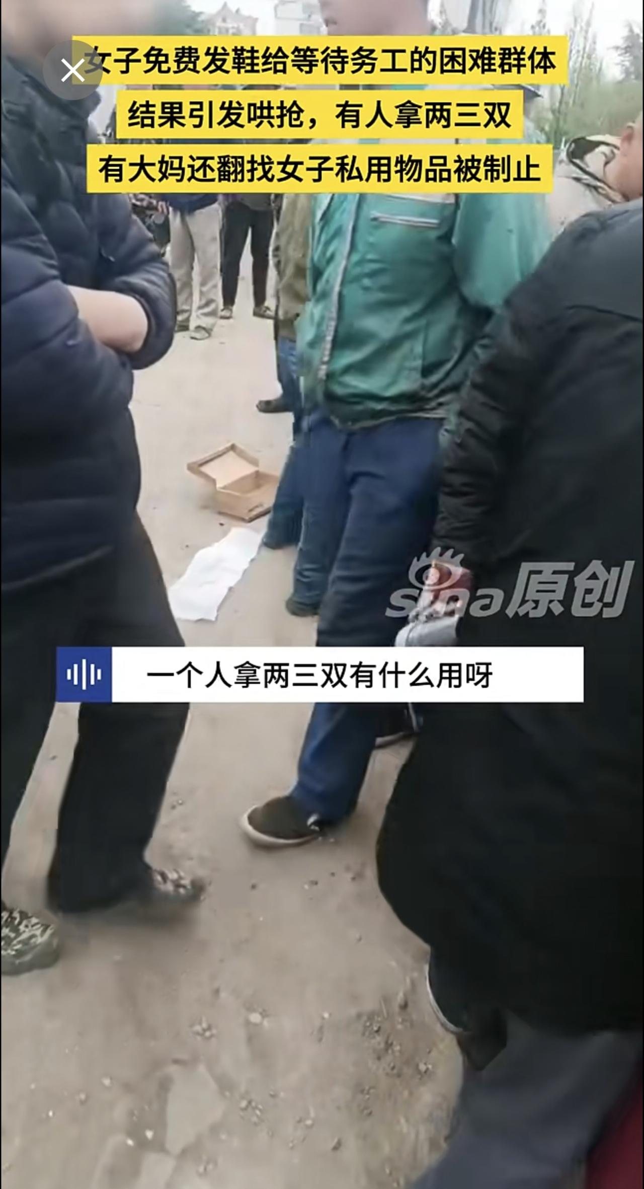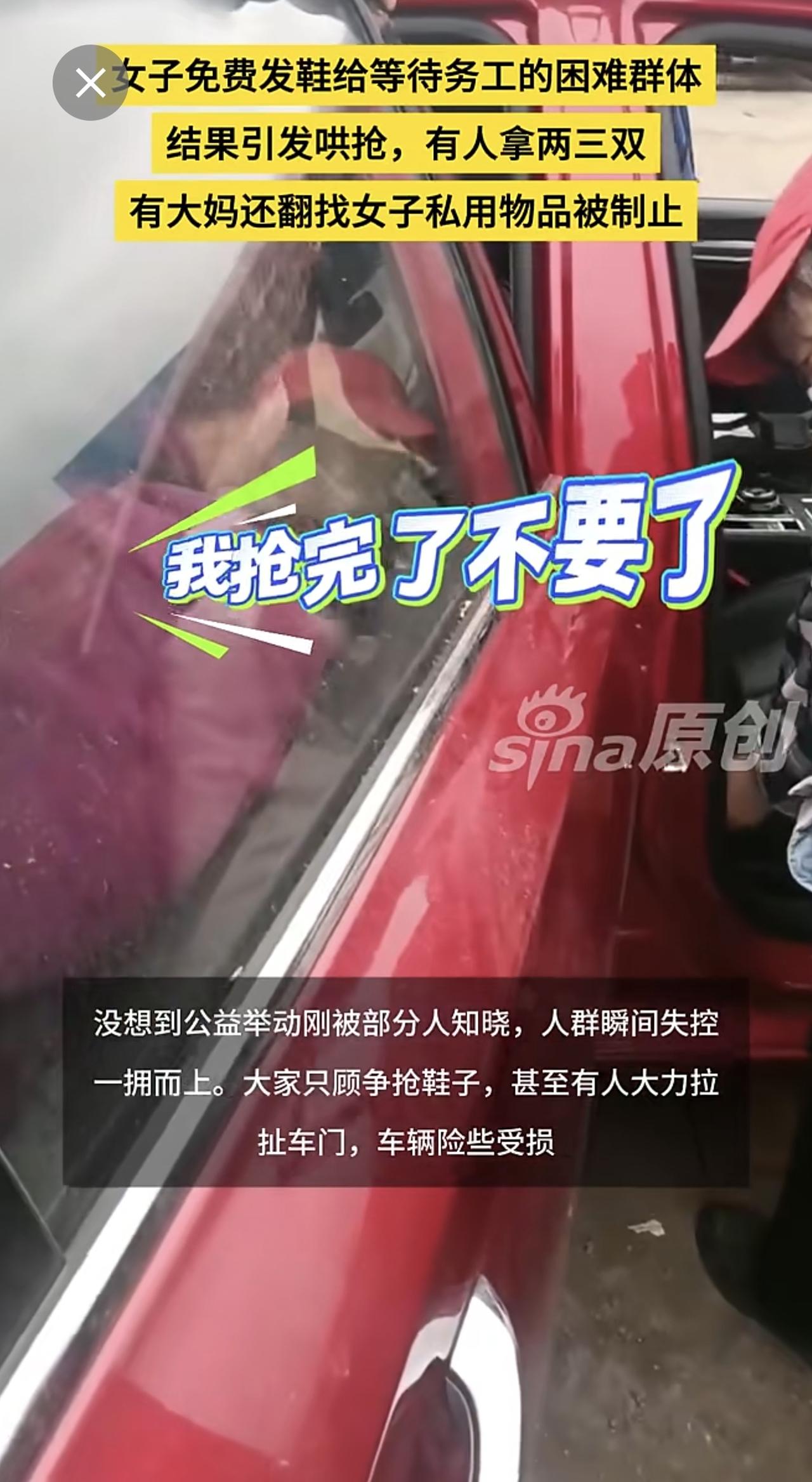 女子免费发鞋给等待务工的困难群体,结果引发哄抢,有人拿两三双,有大妈还翻找女子私