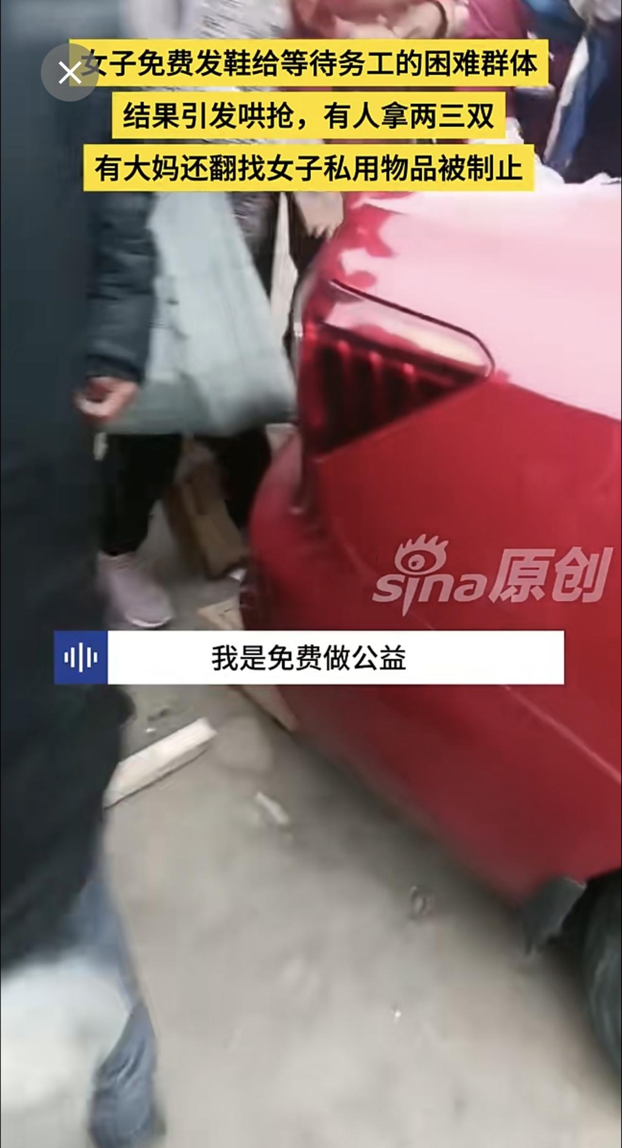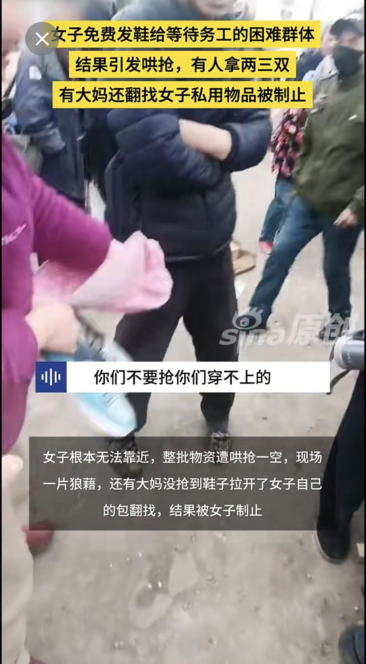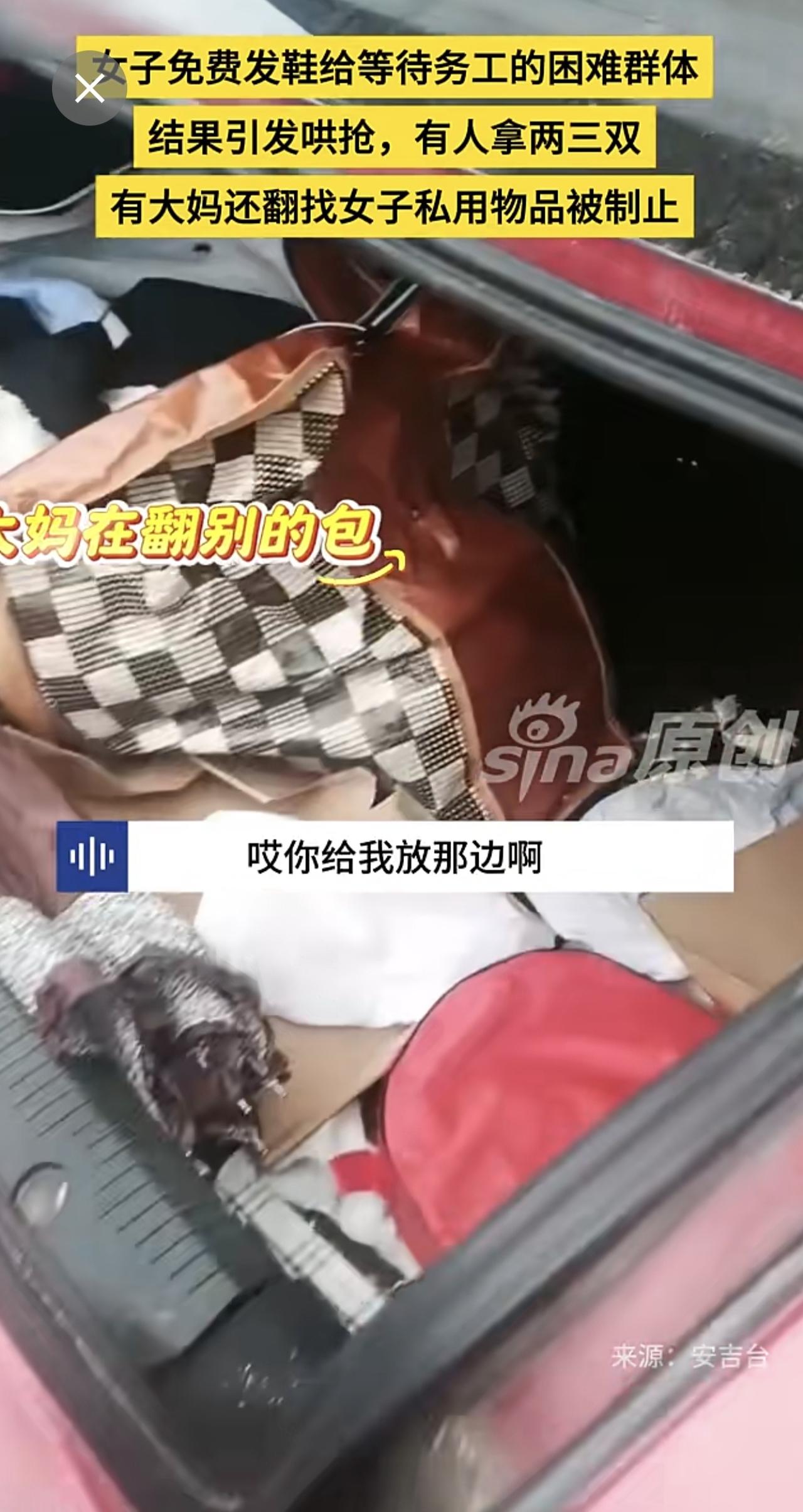 女子免费发鞋给等待务工的困难群体,结果引发哄抢,有人拿两三双,有大妈还翻找女子私