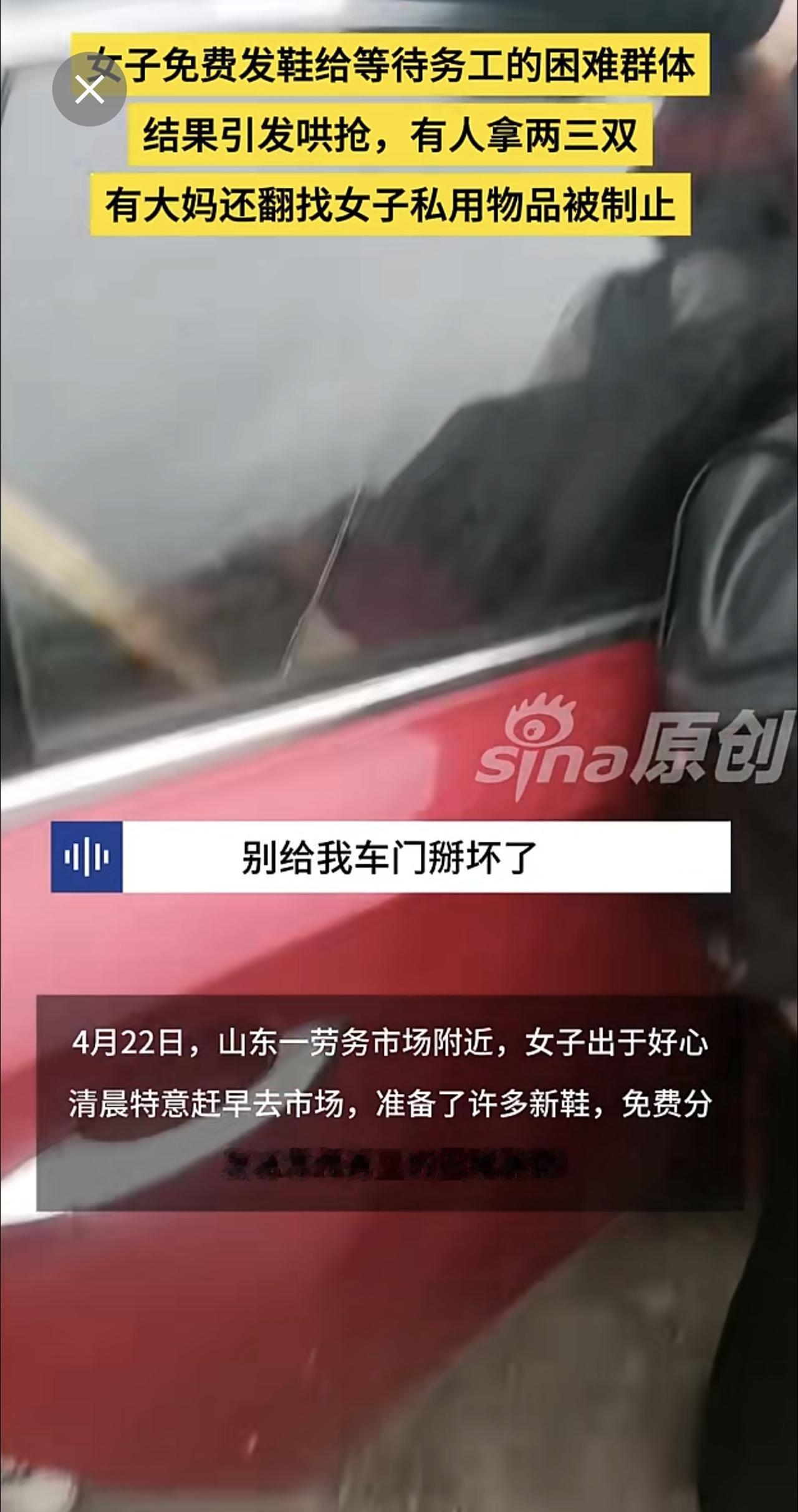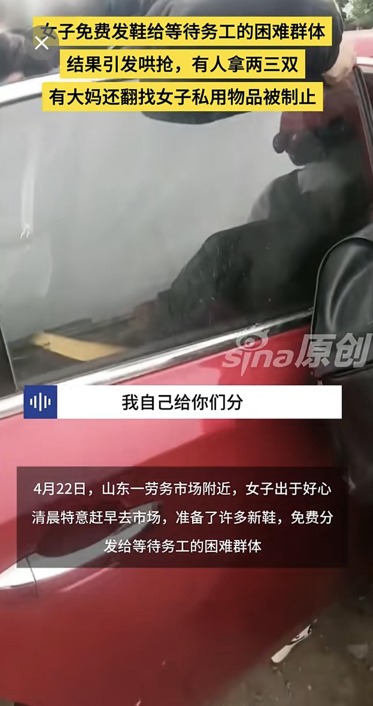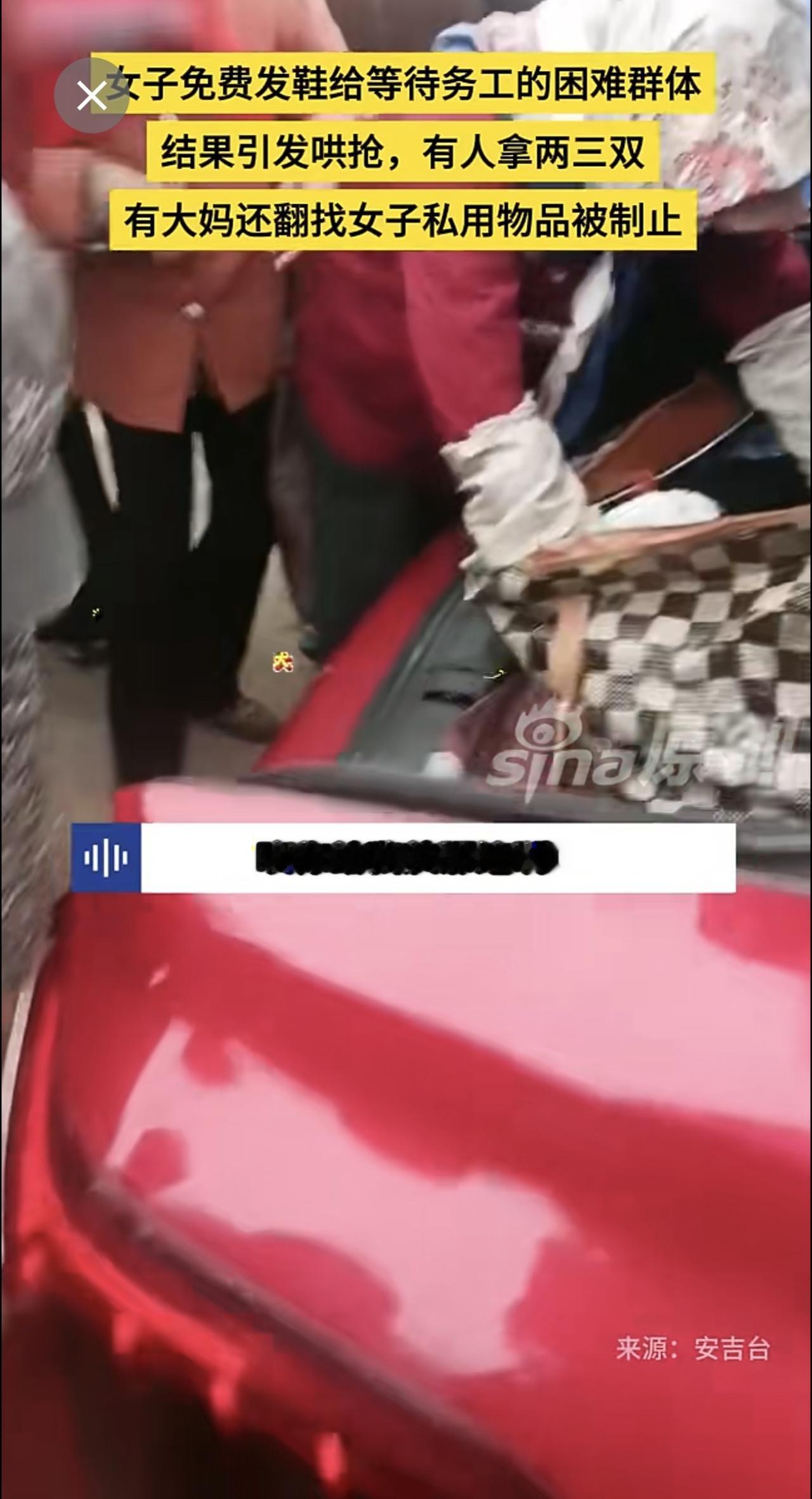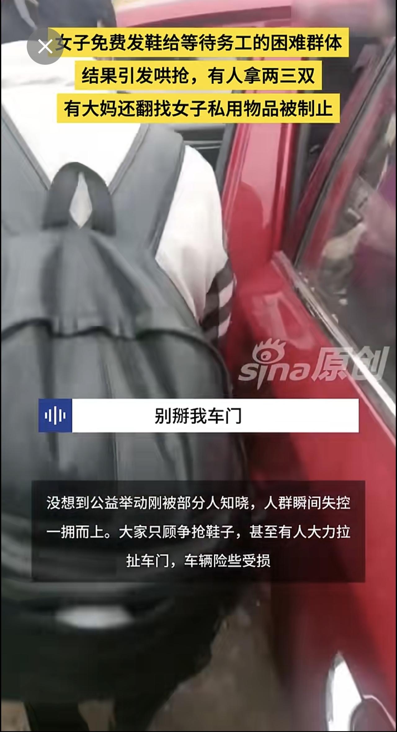 女子免费发鞋给等待务工的困难群体,结果引发哄抢,有人拿两三双,有大妈还翻找女子私