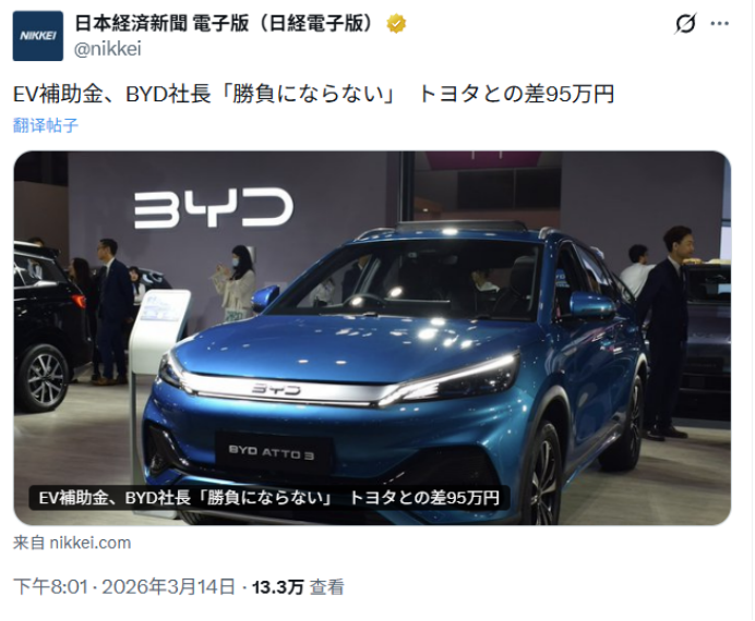 近日,日本经济产业省宣布上调电动汽车补贴上限,最高补助金从90万日元(约合人民币3.92万元)提升至130万日元(约合人民币5.67万元)。日本政府声称此举意在推动本国绿色出行转型,然而政策落地后,所谓“普惠”却成了“排他”的代名词。从实际执行结果看,真正获得最大红利的,是丰田、日产、铃木、特斯拉等日系与美系品牌。与之形成鲜明对比的是,中国车企比亚迪被区别对待,未能从中受益。以比亚迪旗下元PLUS(ATTO 3)在内的四款纯电车型为例,其补贴没有任何上调,维持在35万至45万日元区间,与日系、美系同级车型高达127万至130万日元的补贴相比,差距最高达到惊人的95万日元(约合人民币4万元)。