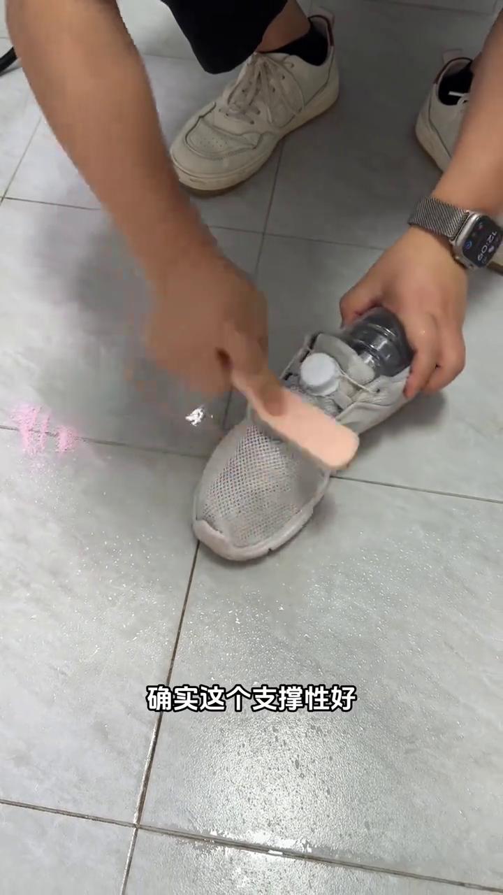 人才,推一下。平时刷鞋子必须手伸到里面受力才好刷,这样又费劲。试一下这个方法,可以这样,怎么是刚刚好的?试一下,很轻松,侧面也可以刷的到,手都不用用力的,确实支撑性好。侧面是这样子,脚后跟,很省力,刚刚好。这是41码的鞋子,太轻松了。