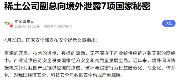 谁能想到,咱们引以为傲、能在全球横着走的“国之重器”,竟然被自己人给卖了?4月23日,国家安全部披露的这桩惊天大案,直接把大伙儿看出一身冷汗。一家稀土公司的副总见钱眼开,竟把7项绝密数据打包送给了境外机构。