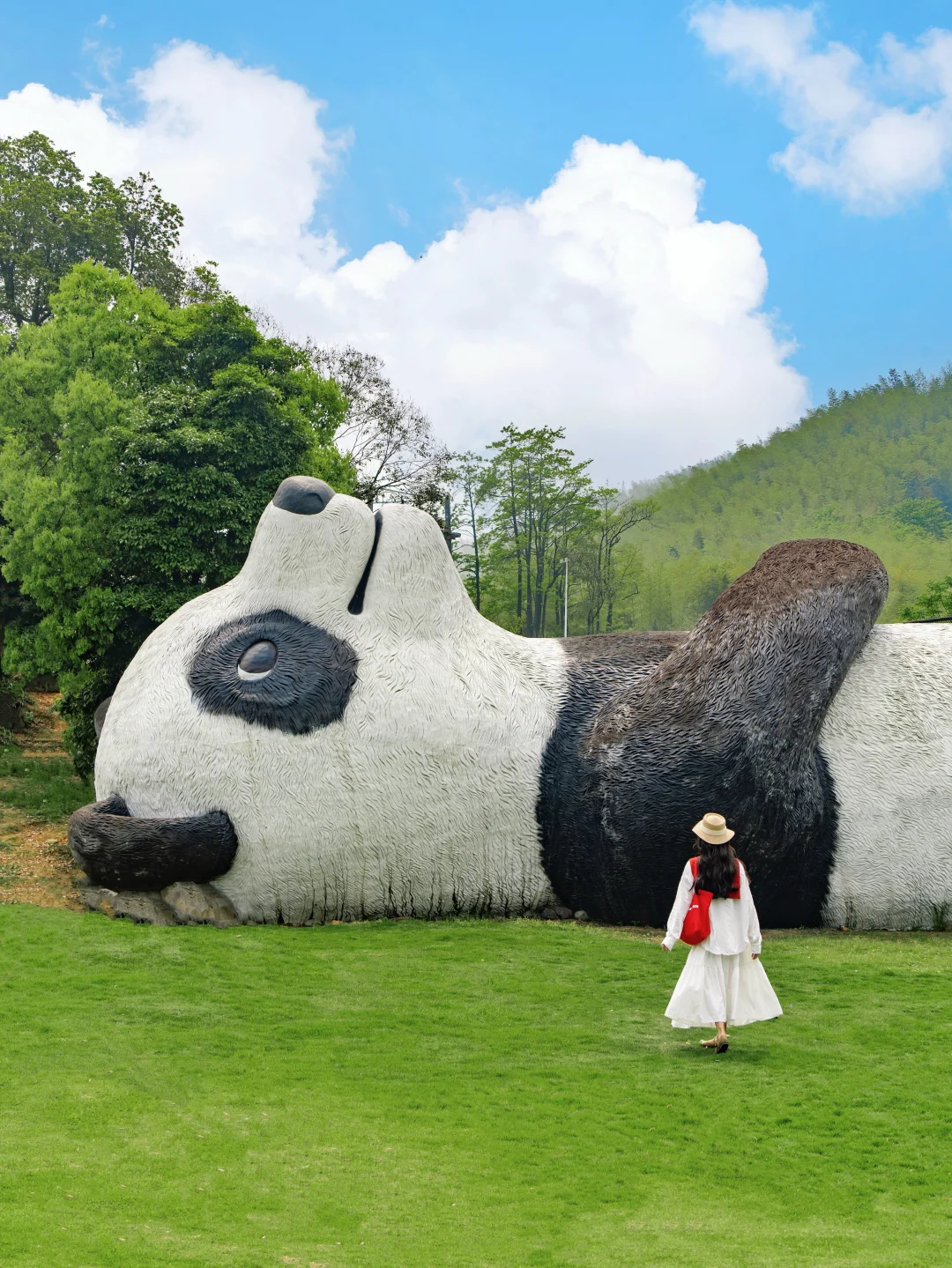 躺在成都同款大熊猫前的草坪上