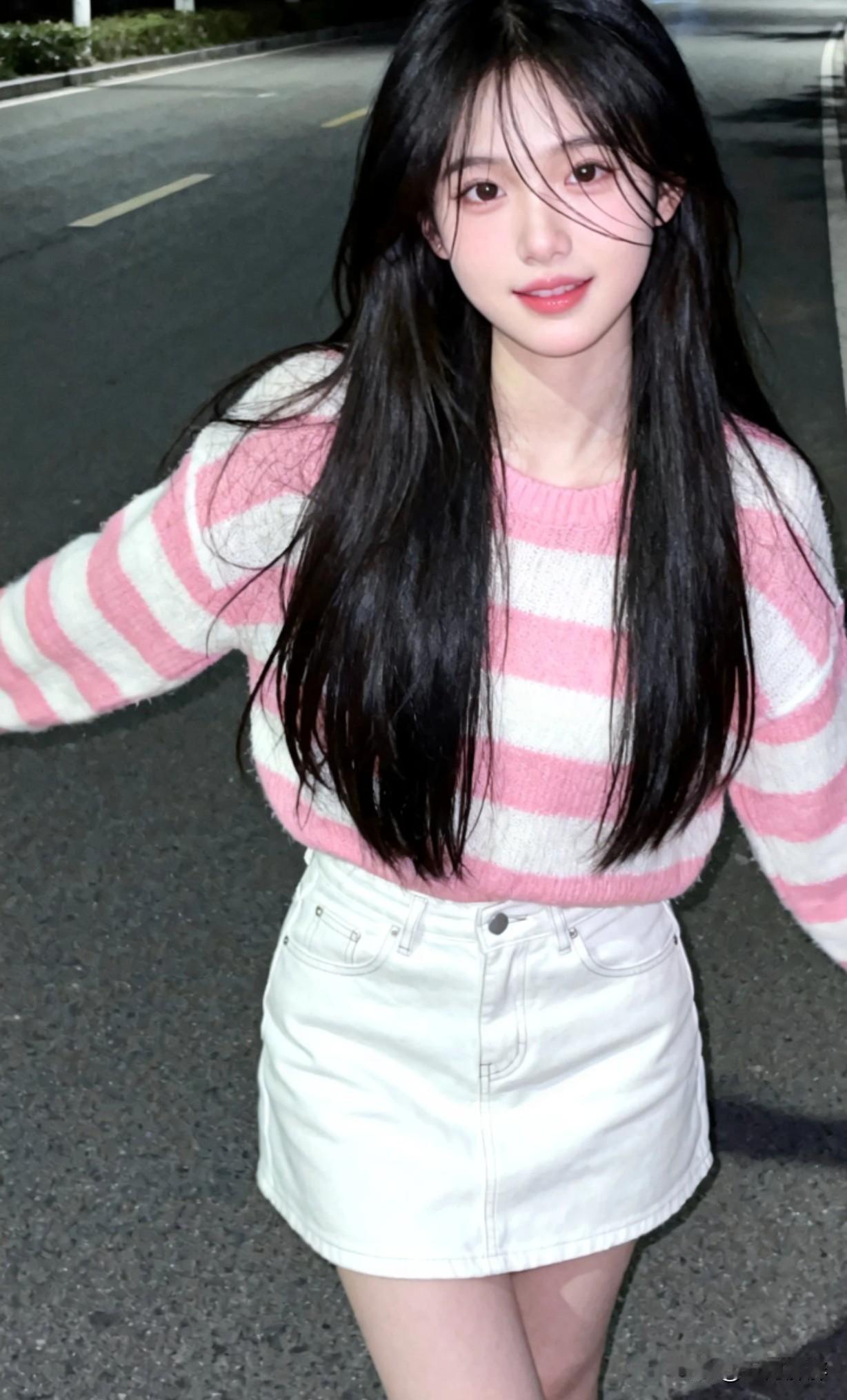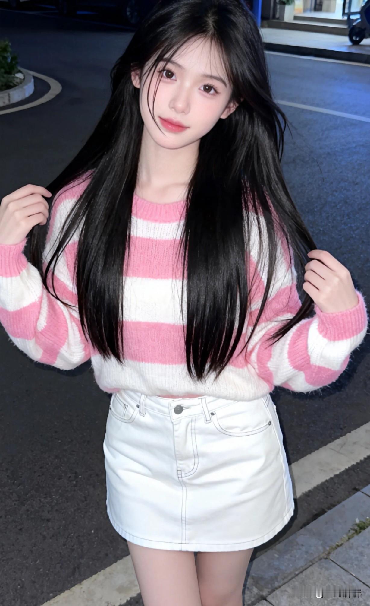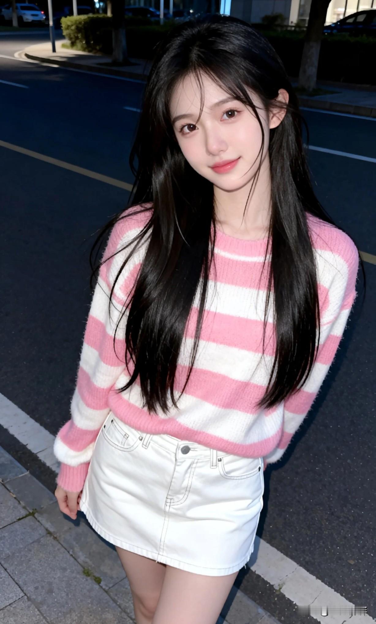 夜晚街拍,甜美少女,粉色条纹毛衣,白色短裙,温柔微笑,,这样的女孩做你的女朋友敢