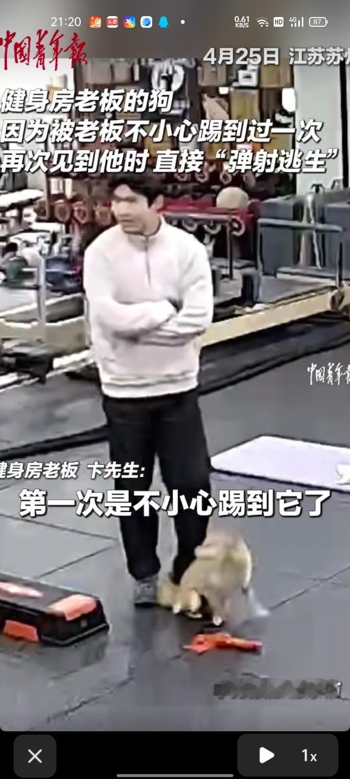 4月25日,江苏苏州。狗:你眼睛瞎啊!这么大的狗看不到吗?踢我!健身房老板的狗因为被老板不小心踢到过一次,再次见到他时,没想到它直接“弹射逃生”,让所有人哄堂大笑