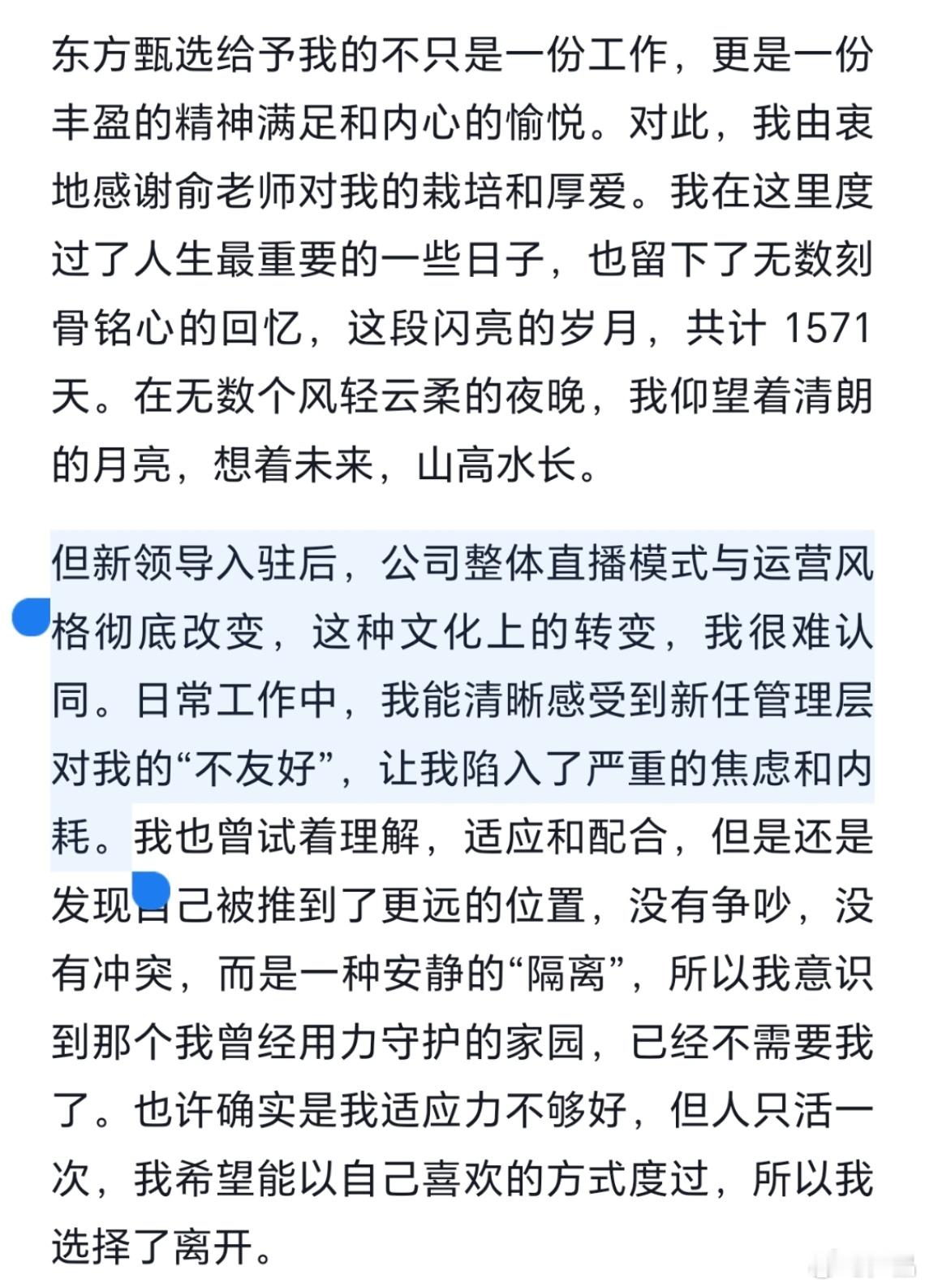 俞敏洪坦言公司管理方式出现偏差看了东方甄选明明的正式离职官宣,从业整整1571天。离职根本原因:1️⃣新管理层上任后,公司直播模式和运营风格彻底大变,文化理念难以契合。2️⃣明明遭管理层无声边缘化、被安静隔离,长期陷入焦虑与精神内耗,没有争执却被慢慢疏远。