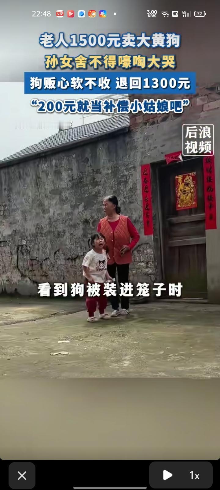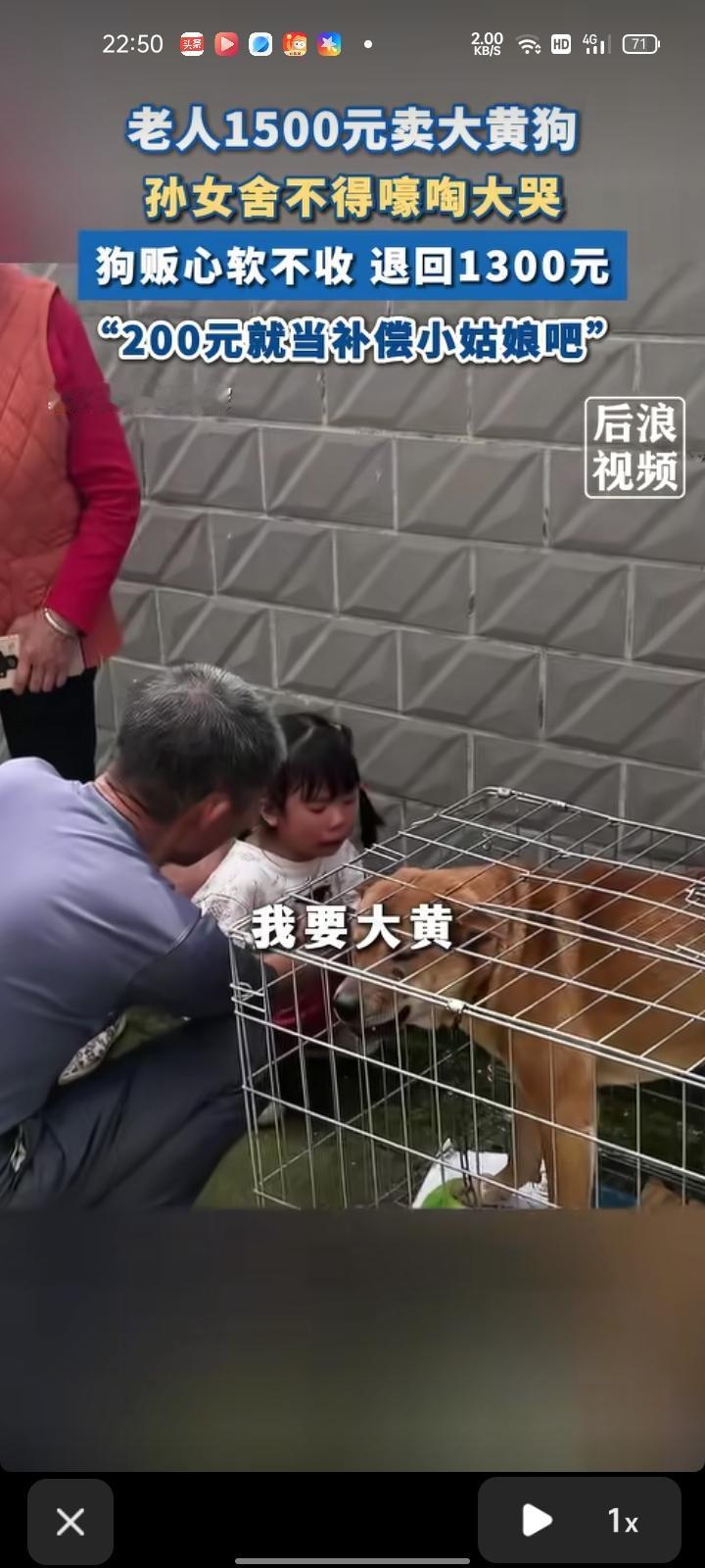 4月18日,广西桂林。老人出1500元卖大黄狗,孙女看到狗被装进笼子时,哭的撕心裂肺。最终,狗贩心软就决定不收了,让老人别卖了,并且只要求退回1300元,主动少要200元,200元就补偿给那孙女买玩具。
