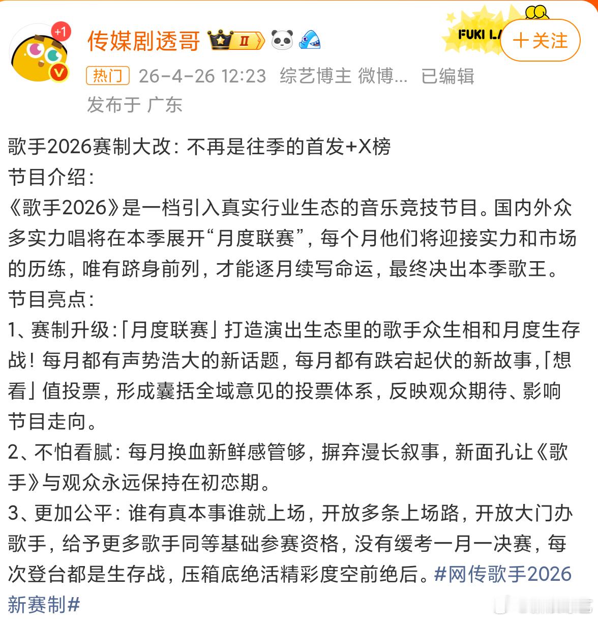 网传歌手2026新赛制网传歌手2026将出采用创新赛制-"月度联赛制",通过每月末位淘汰、中位保留、榜首直通总决赛的分层晋级机制,试图解决往季歌手档期冲突和观众审美疲劳问题。你期待本季歌手的赛制创新吗?