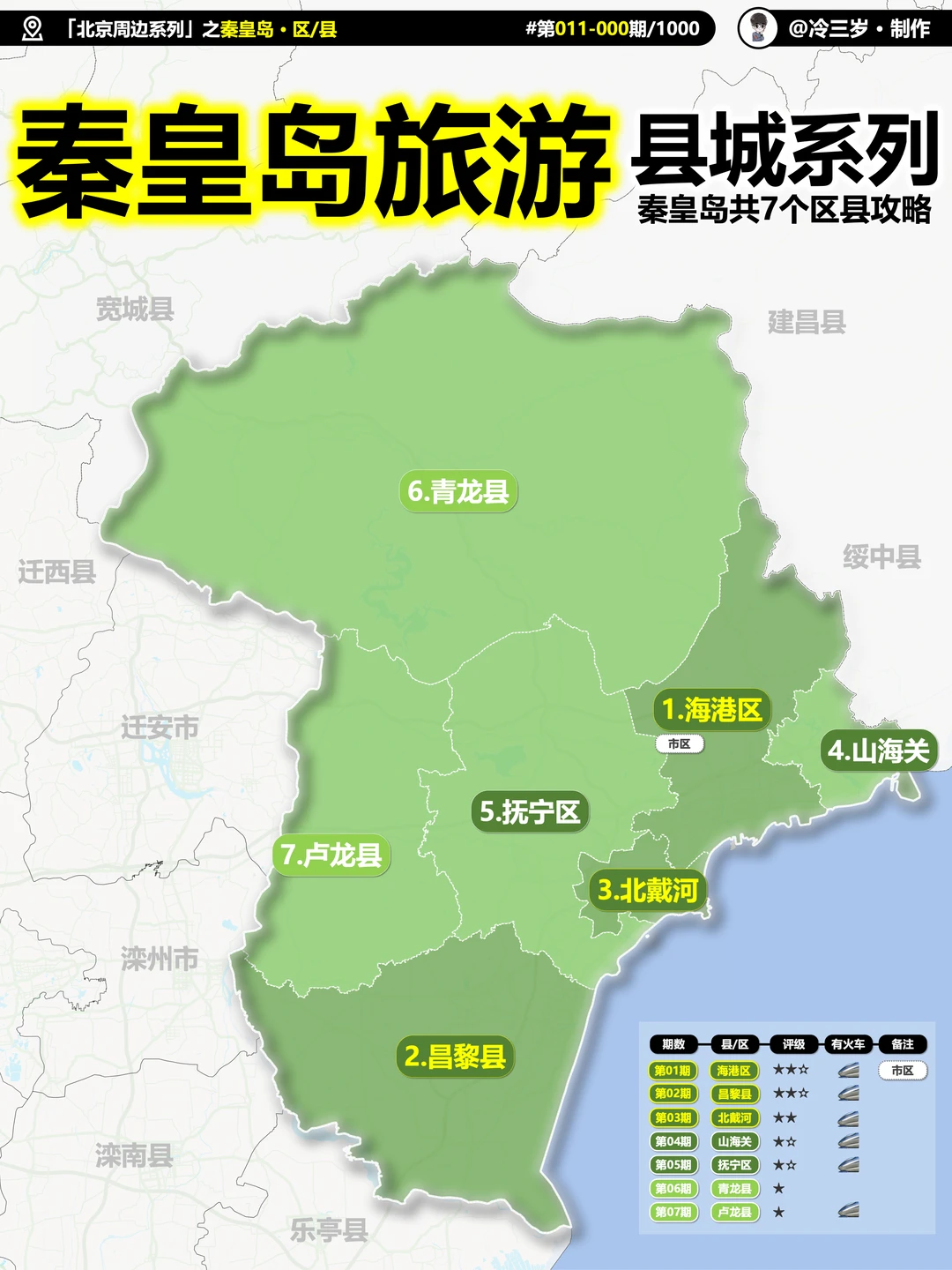山海关、市区(海港区)、北戴河、昌黎县(主要有阿那亚)