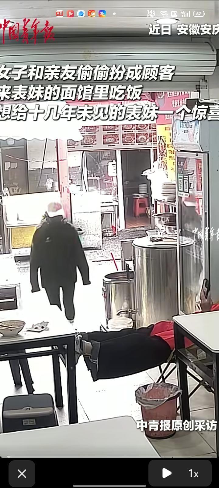 4月20日,安庆市岳西县。女子和亲友偷偷扮成顾客,来表妹的面馆里吃饭,想给十几年未见的表妹一个惊喜,三人不约而同地笑了起来,流下激动泪水