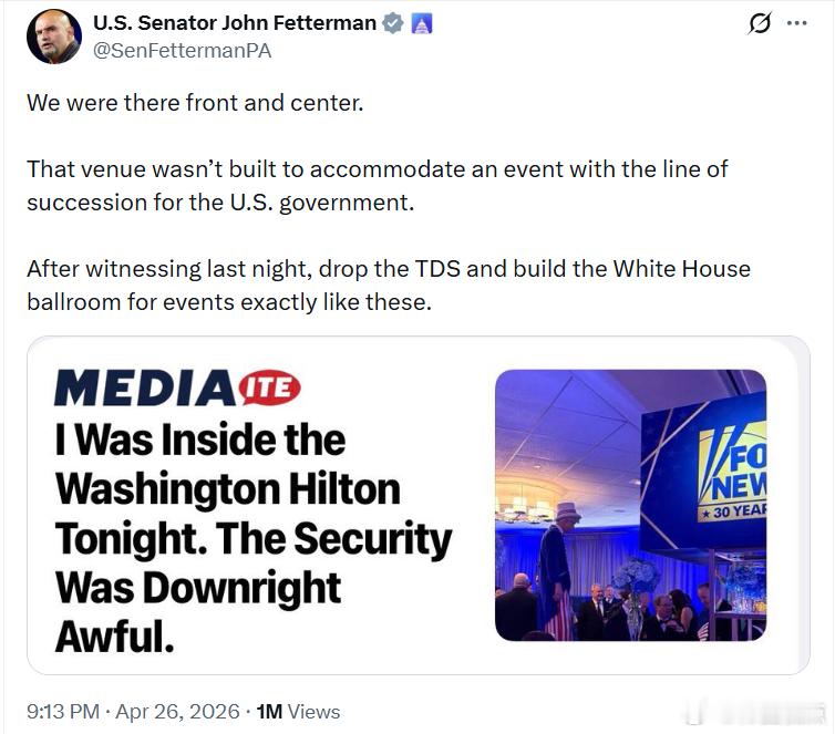 经历了昨晚的事,就别再被所谓的“TDS”带偏了,赶紧把白宫宴会厅建起来吧,这种场合本来就该在那种更安全的地方举行。