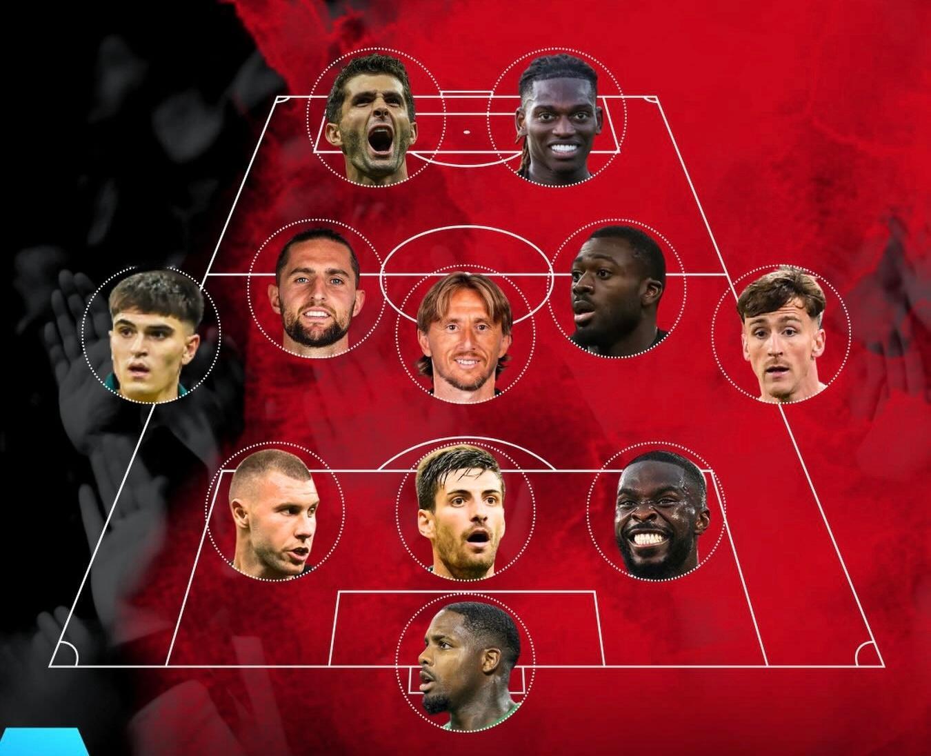 萨勒马科尔斯🇧🇪、福法纳🇫🇷、莫德里奇🇭🇷、拉比奥特🇫🇷、巴特萨吉🇮🇹组成五中场;