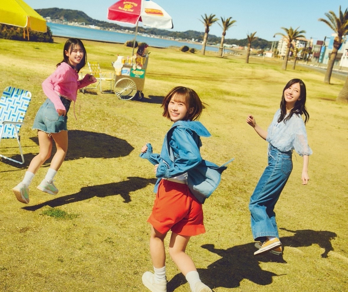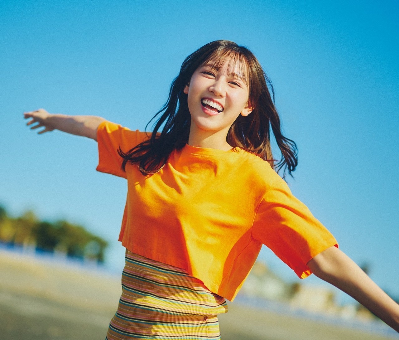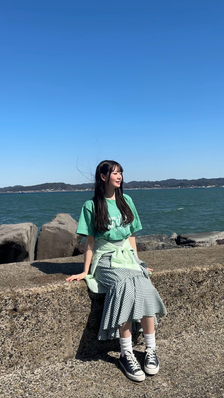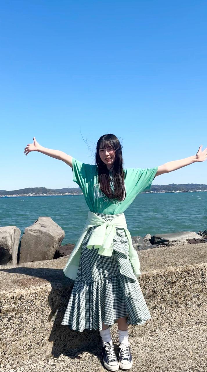 坂井新奈「海です!とても海に行きたかったので、本当に気持ちよかったです。海風を沢山感じました🍃なんだか風好きなんですよね!風が強すぎてみんなで笑いあったりすると本当に楽しくて心地よくて🌿緑のお洋服きました!あまり着たことのないカラーだったので新鮮でした~大好きな3人とです!美月、ひなのん、いずきと走りましたー!」