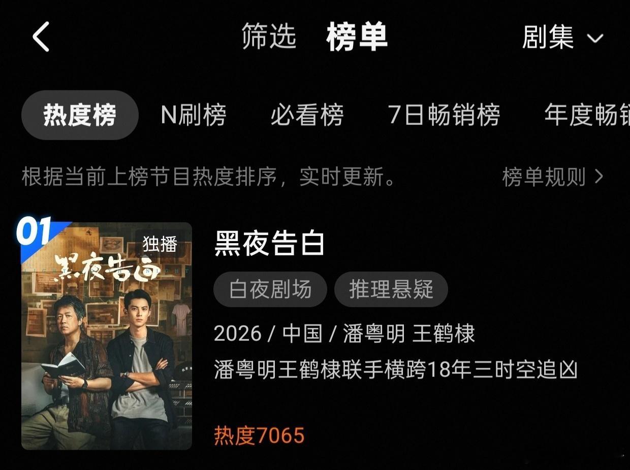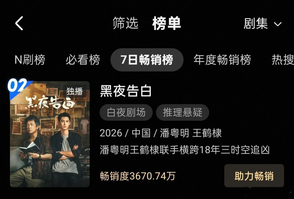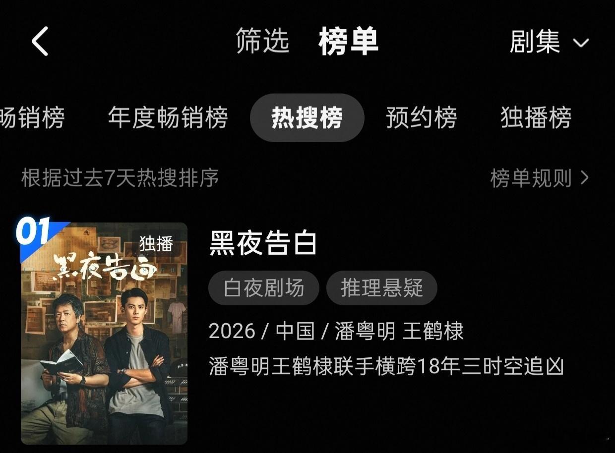 王鹤棣的黑夜告白昨日开播首日,不仅冉方旭站内角色热度破亿,且热度破7000,还横扫热度榜+热搜榜+独播榜+悬疑榜+刑侦榜+年代榜霸占数个第一,还成为七日拉新周榜第二,首日成绩相当之不错!