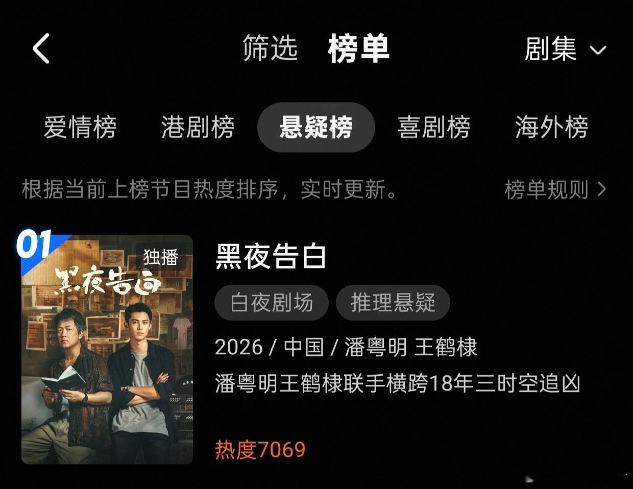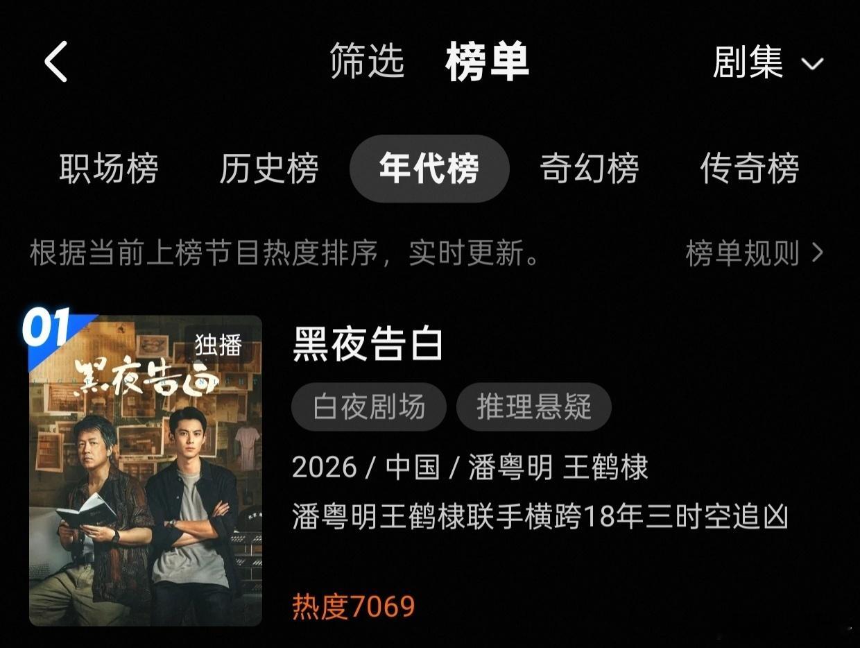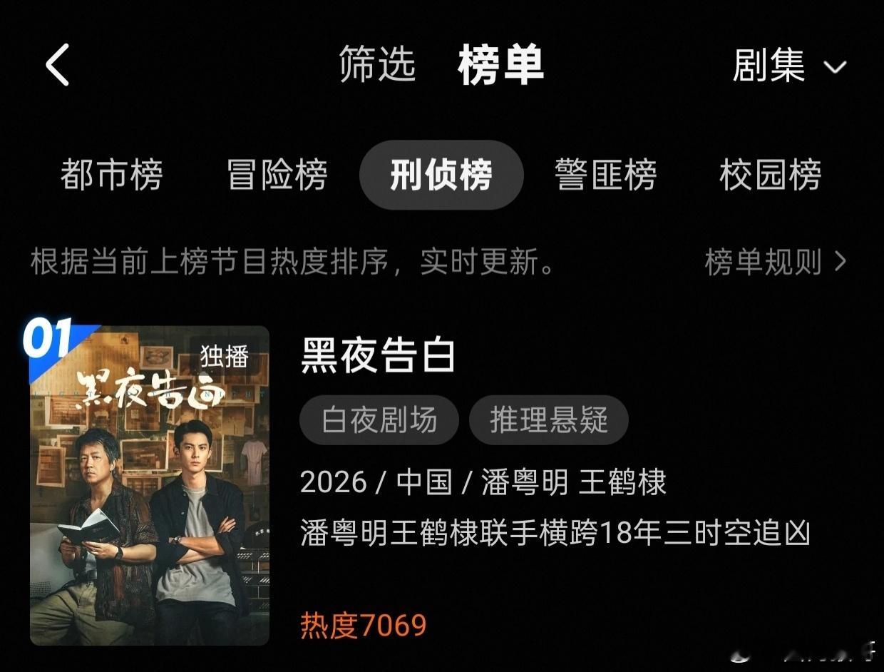 王鹤棣的黑夜告白昨日开播首日,不仅冉方旭站内角色热度破亿,且热度破7000,还横扫热度榜+热搜榜+独播榜+悬疑榜+刑侦榜+年代榜霸占数个第一,还成为七日拉新周榜第二,首日成绩相当之不错!