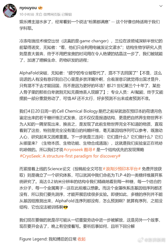 4月26日,颜宁院士通过个人微博发文:“娱乐博主潜水多了,经常看到一个说法‘粉黑都满意’——这个好像也特适用于我们学科耶。冷冻电镜技术横空出世(这真的是game changer),三位在该领域深耕半世纪的前辈得诺奖,无知者:‘看,他们只会利用电镜发论文灌水’;结构生物学研究人员则是喜大普奔,终于不用把宝贵的时间用在令人绝望的结晶这一步了,我们被赋能了,加速了理解生命、药物研发的进程。”