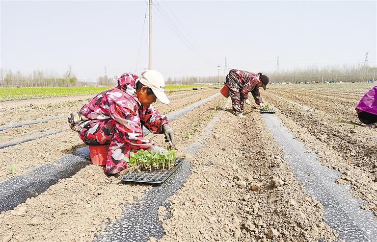 走进永清县韩村镇楼台村源菜蔬菜种植农民专业合作社的种植基地,连片的菜地平整开阔,工人们分工协作,熟练地进行运苗、放苗、覆土、压实等工序。合作社负责人刘兵告诉记者,800余亩春菜定植工作即将完成。
