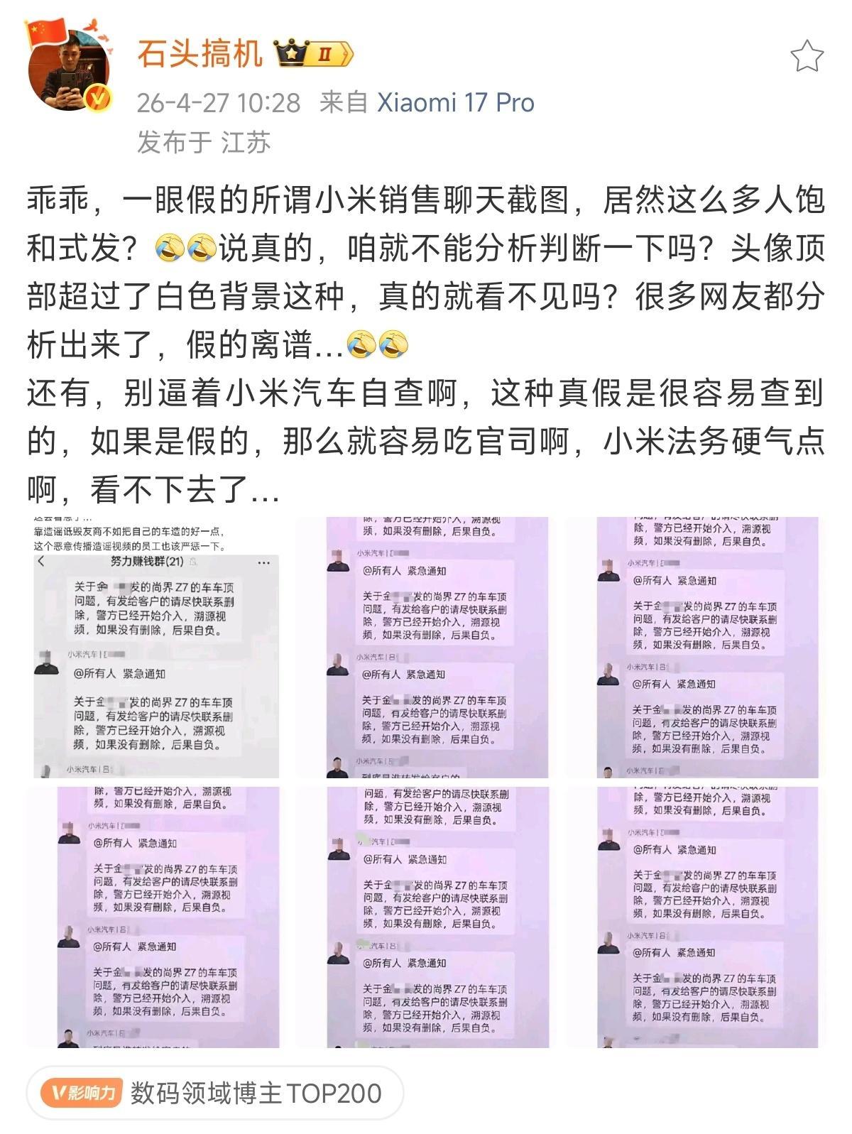 我刚好到我SU7 Max交付群截图了一下,几个特点:1,带小米汽车的,全企业微信号+标准头像+名字格式,个人销售完全不挂小米汽车相关标识,无标准头像(比如群里卖保险的,帮上牌的,金融服务的)2,衣服的logo在图片右边3,名字在前,加上“我不知道这种群体性的,AI生成/P图假图谣言传播在国内是不是违法行为,但是看起来对方似乎笃定自己粉丝的认知能力较高,一定能发现问题并且指正,所以用这种图来考验粉丝吧 王一博